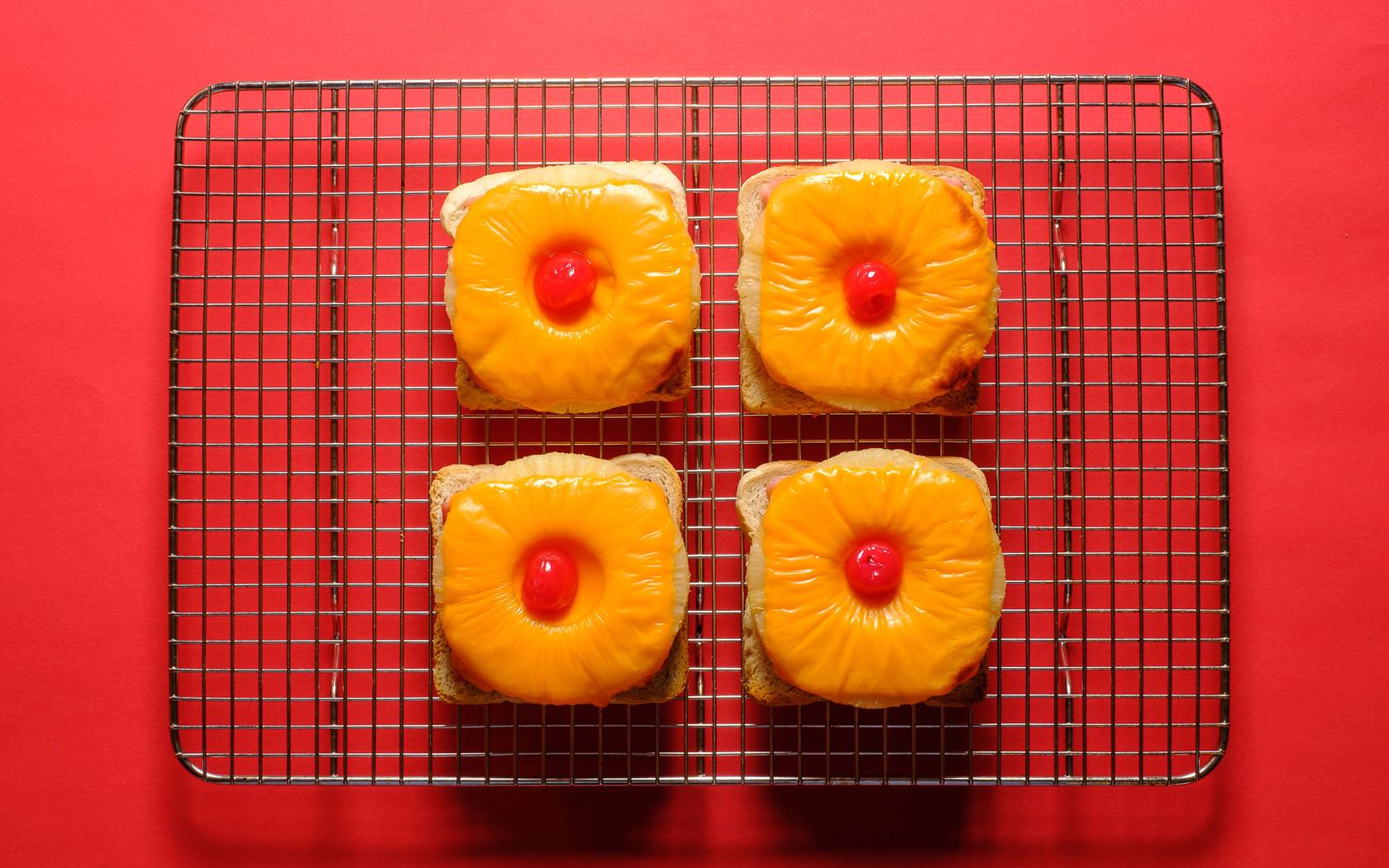 Röste das Brot leicht vor, damit es knusprig bleibt, und belege es dann mit Schinken, Ananas, Käse und deiner Kirsche nach Wahl.