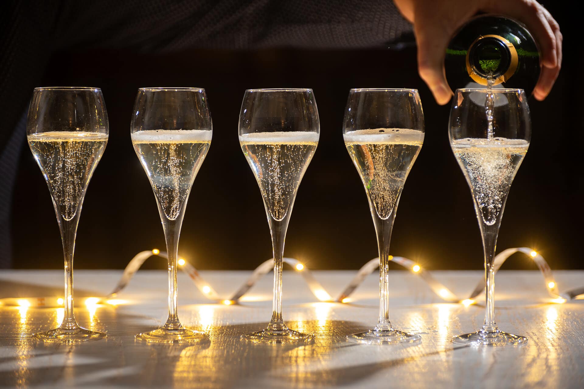 - New year party, pouring of brut champagne bubbles cava or prosecco wine in tulip glasses with garland lights on background: © barmalini - stock.adobe.com