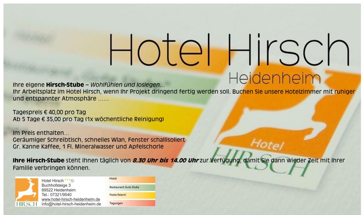 Im Zuge der Corona-Krise ist das Geschäft mit Übernachtungsgästen fast völlig zum Erliegen gekommen. Besondere Situationen verlangen neue Ideen. Viele Hotels im Land bieten nun auch Arbeitsplätze als Homeoffice für Gäste an. Wenn konzentriertes Arbeiten zu Hause nicht möglich ist, weil die Kinder zu laut spielen oder der Partner „nur kurz“ mal eine Frage hat, dann bieten Hotels die perfekte Alternative! Vorteile dabei sind eine gute technische Ausstattung der Zimmer mit schnellem WLAN, ausreichend Ruhe und auf Wunsch ein kulinarisches Versorgungspaket.
