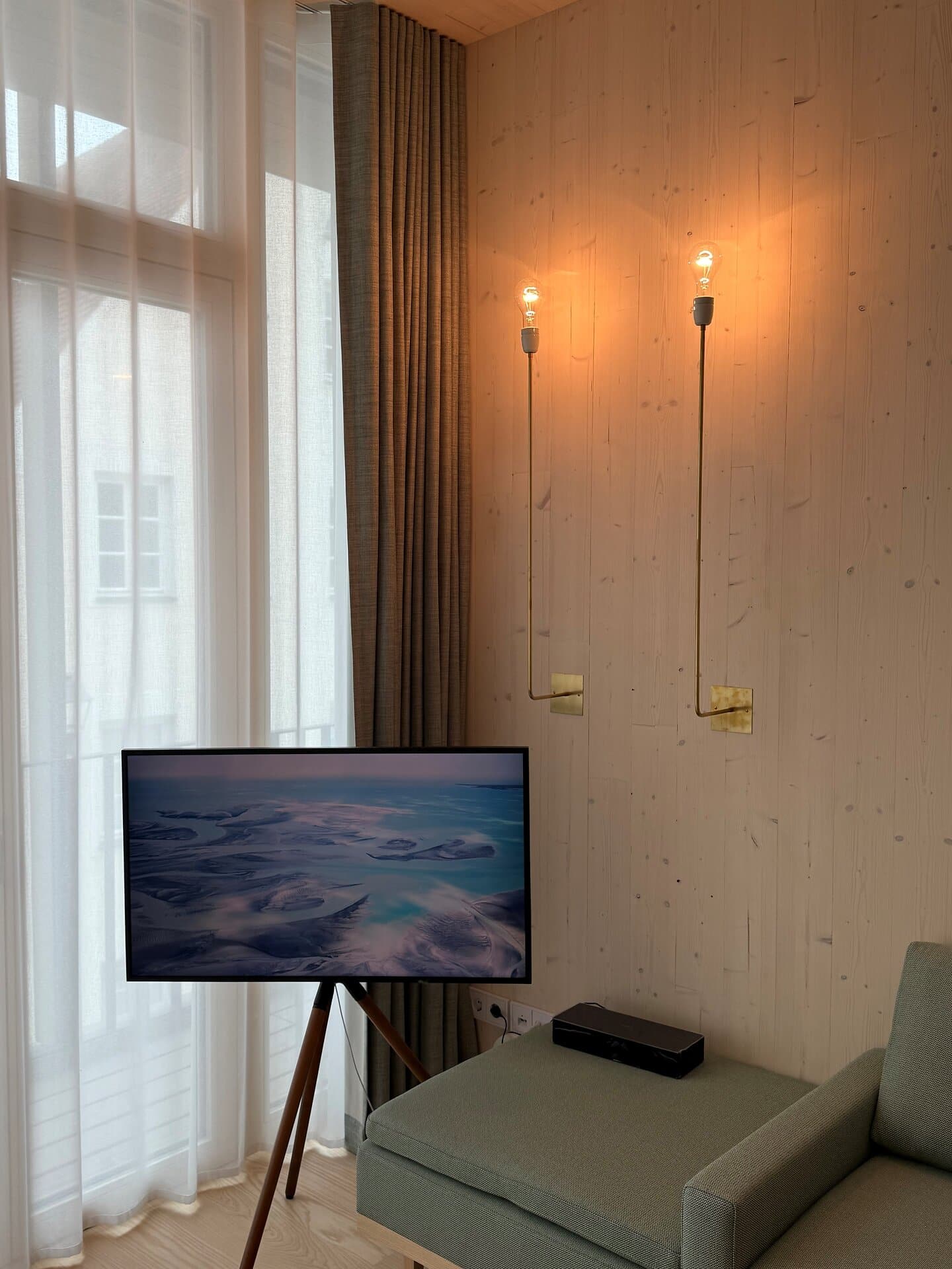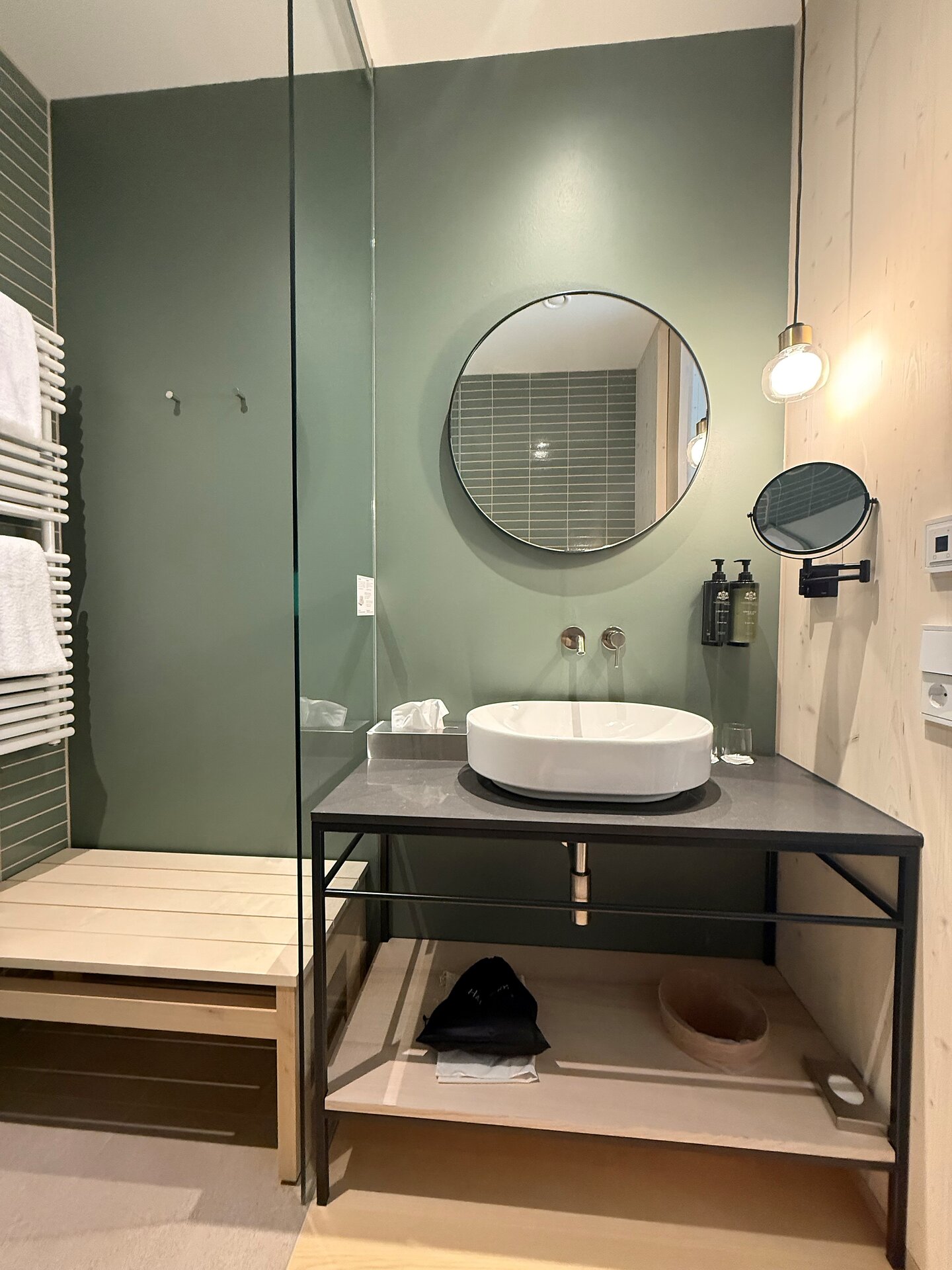 Das modern gestaltete Zimmer überzeugte mit einem großzügigen Grundriss, durchdachter Ausstattung und einem harmonischen Farbkonzept mit viel Naturholz und sanften Grüntönen. Schön auch die Lichtgestaltung: Hochwertige Designleuchten schaffen mit ihrer modernen, reduzierten Ästhetik nicht nur optische Highlights, sondern sorgen für ein stimmiges Lichtambiente. Große Fensterfronten, ein langgezogener Balkon, ein helles Badezimmer mit Regendusche und ein stimmiger Mix aus Komfort und Zurückhaltung sorgten für ein wohltuendes Wohngefühl. Technisch war alles auf neuestem Stand – von der Steckdose in Bettnähe über die Klimaanlage bis zum Smart-TV funktionierte alles, wie es soll. Und auch die Sauberkeit ließ keine Wünsche offen.