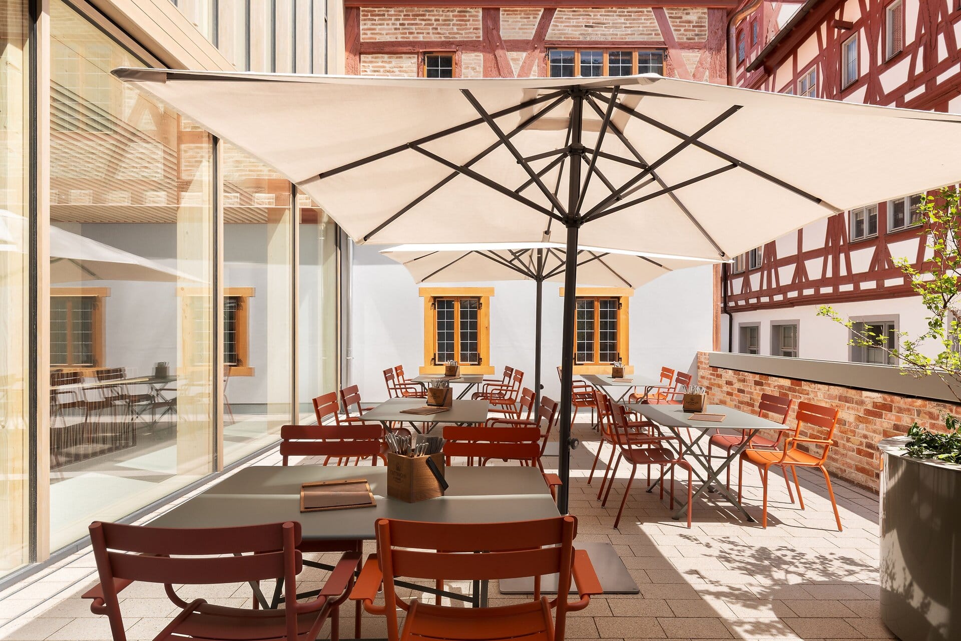 Erwähnenswert sind auch die beiden Terrassen, die das kulinarische Erlebnis nach draußen verlängern: Eine vor dem Hotel, die andere ruhig und grün gelegen hinter dem Haus, direkt am Hofgarten. Dort befindet sich auch der historische Kronensaal, eine beeindruckende Eventlocation mit charakteristischem Zollingergewölbe, die für private Feiern und Tagungen gleichermaßen genutzt werden kann.