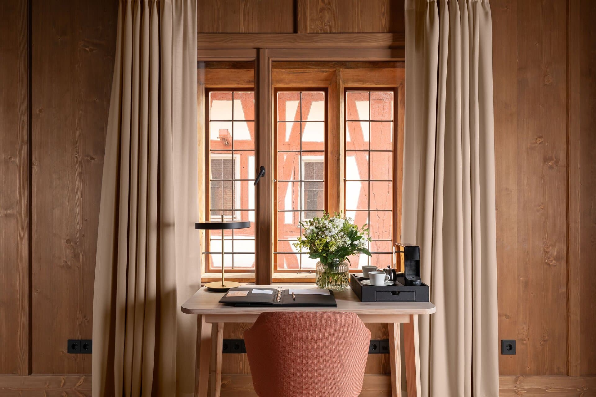 Mitten auf dem historischen Marktplatz von Oettingen gelegen, ist die Krone weit mehr als nur ein traditionsreiches Gasthaus – sie ist ein architektonisches und gastronomisches Bekenntnis zur Verbindung von Geschichte und Gegenwart. Im Rahmen eines großangelegten Sanierungsprojekts wurde das ehemalige fürstliche Gasthaus aus dem 15. Jahrhundert liebevoll instandgesetzt und um einen eleganten Neubau erweitert. Noch während meines Besuchs Ende Mai 2025 befand sich das Hotel im Pre-Opening, was sich allerdings nur dezent in kleinen Details bemerkbar machte: Einige Restarbeiten am Außenbereich, letzte Handgriffe im Technikbereich – der Hotelbetrieb lief davon unbeeindruckt und bereits in nahezu vollständiger Qualität.