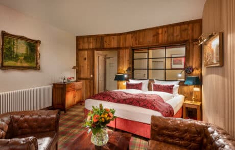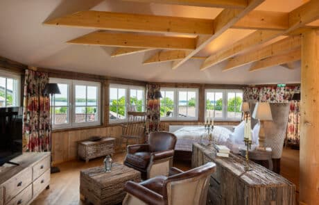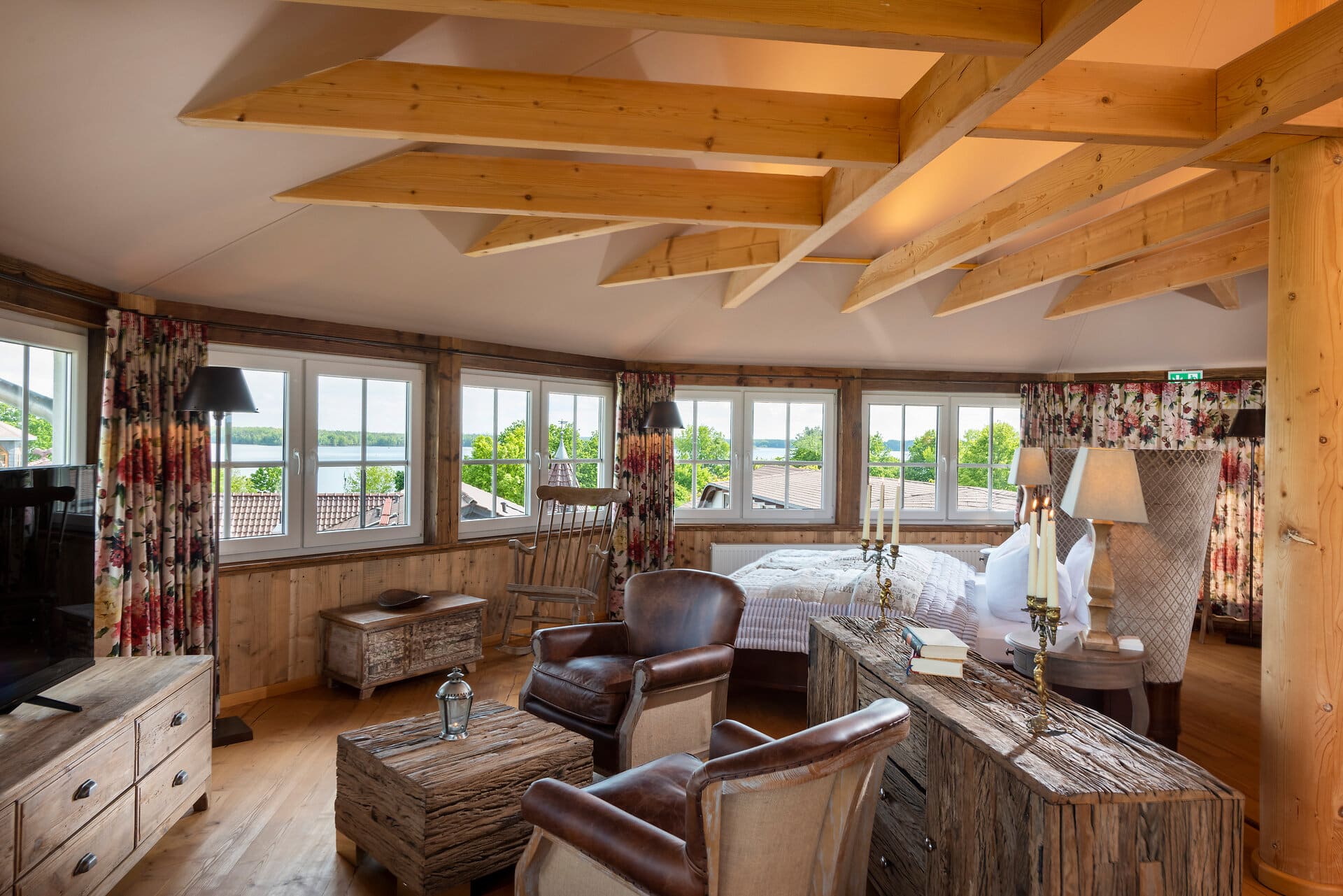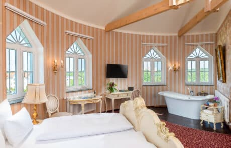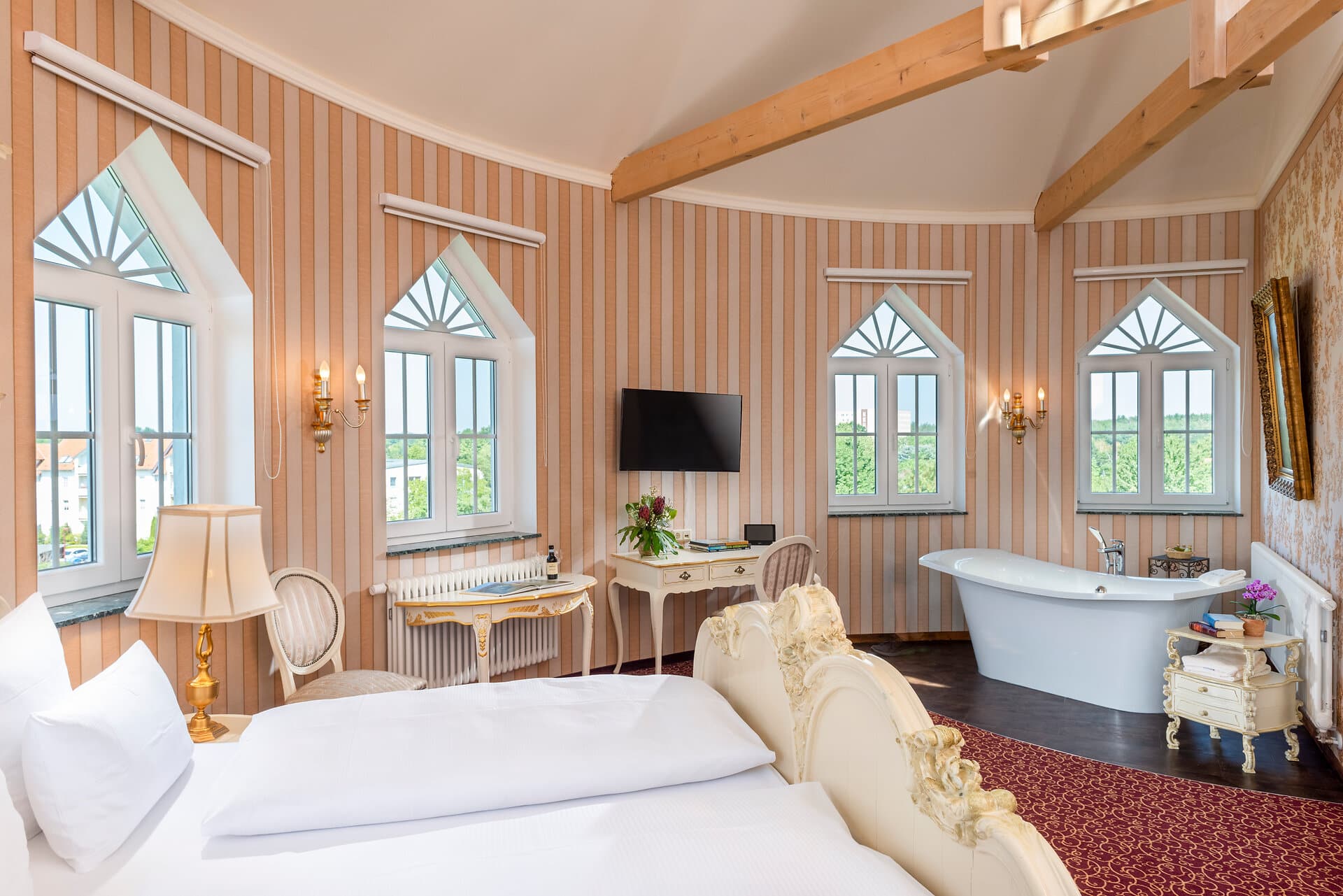 Mit nur 52 Zimmern auf rund 10.000 Quadratmetern wird hier ein Maß an Ruhe und Privatsphäre geboten, das in dieser Dichte sicherlich außergewöhnlich ist. Die Wohneinheiten verteilen sich auf mehrere Gebäude. Es gibt ganz unterschiedliche Kategorien – von Cozy-Wellnesszimmern über Deluxe- und Superior-Zimmer bis hin zu luxuriösen Suiten wie See-, Schloss-, Garten-, SPA-, Turm- und Panorama-Suiten. Sie bestechen durch ihren charmant-opulenten Stil und sind mit viel Liebe zum Detail individuell eingerichtet. Hochwertige Materialien, ausgewählte Antiquitäten und teils offene Bäder verleihen jedem Raum eine besondere Atmosphäre. Obwohl alle Unterkünfte eine elegante und luxuriöse Grundnote teilen, unterscheidet sich jede Suite in Gestaltung und Charakter, so dass Gäste je nach Geschmack das für sie passende Ambiente genießen können.