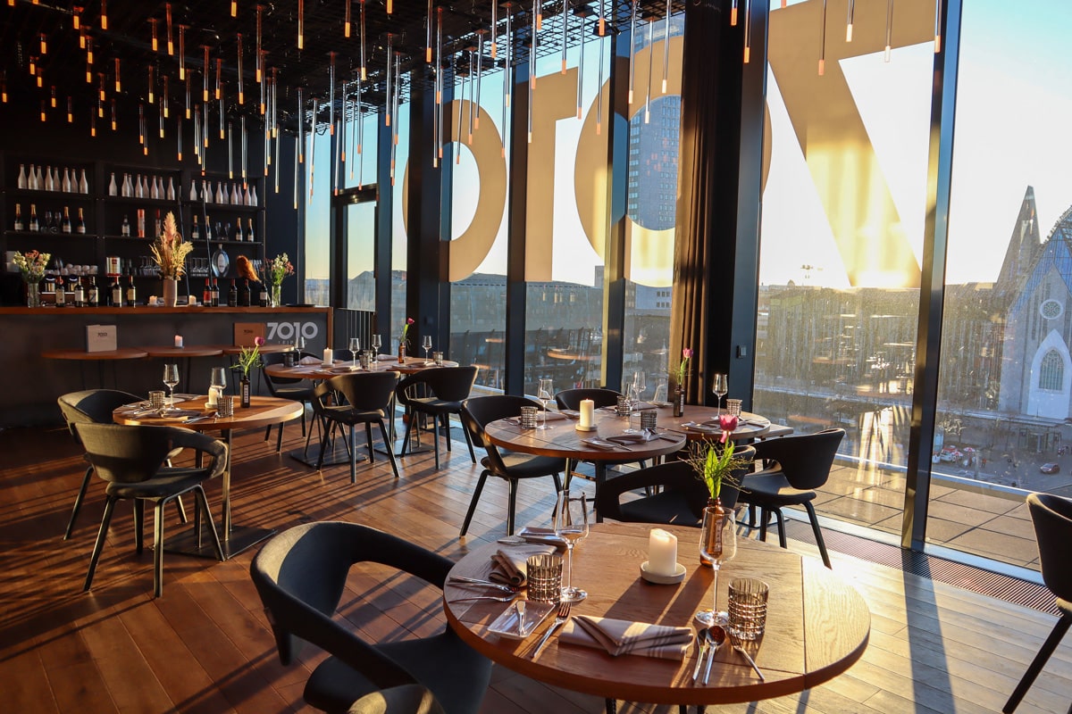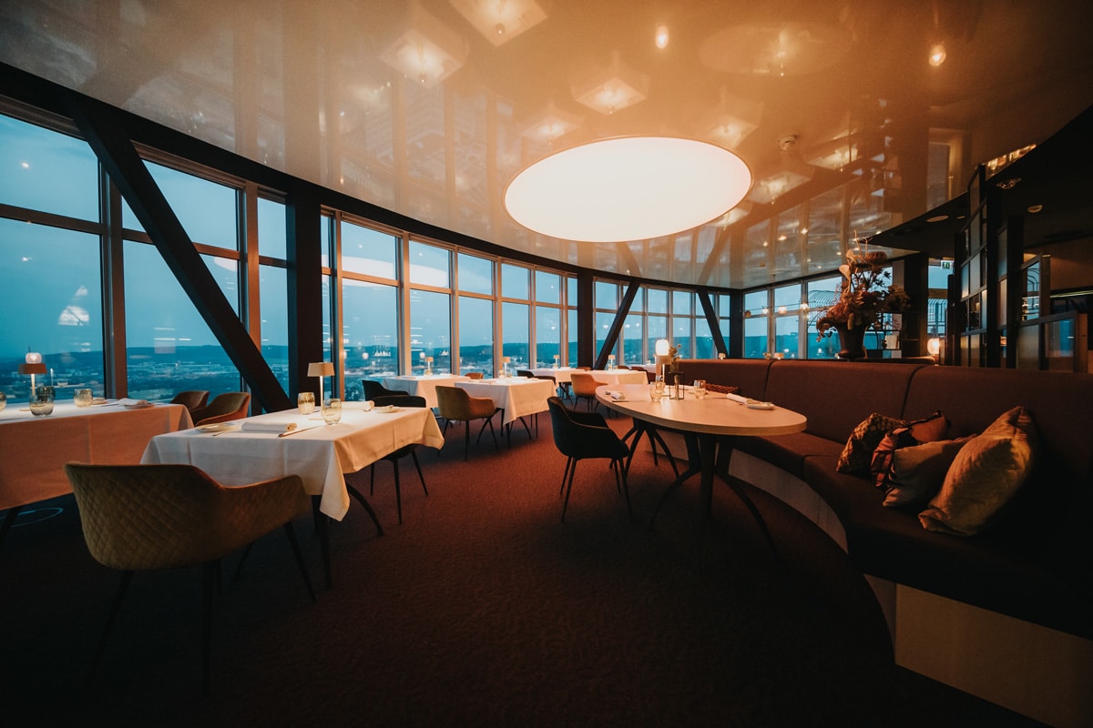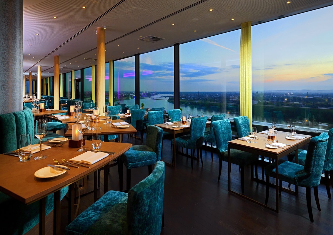 Das Restaurant in der siebten Etage der Leipziger Hauptpost am Augustusplatz bietet einen atemberaubenden Ausblick über die Dächer Leipzigs. In lässig-urbanem Ambiente mit offener Küche werden hier geradlinige europäische Gerichte mit asiatischen Einflüssen aufgetischt. | Foto: © Restaurant 7010 Schloss-Restaurant Auf Scharffeneck | St. GoarDas Schloss Rheinfels war einst die mächtigste Festungsanlage am Rhein und bietet einen einzigartigen Ausblick auf den Mittelrhein. Diesen besonderen Blick genießt man am besten im Schloss-Restaurant Auf Scharffeneck mit Wintergarten. Hier wird man mit moderner deutscher Küche mit internationalen Einflüssen verwöhnt. | Foto: © Hotel Schloss Rheinfels The Roof Restaurant | Frankfurt am MainDas Restaurant The Roof befindet sich in der 12. Etage des neuen b'mine Hotels in Frankfurt am Main. Internationale und regionale Foodklassiker treffen hier auf eine bunt-minimalistische Atmosphäre. Bei schönem Wetter lädt die Terrasse zum Schlemmen ein - immer mit Blick auf die startenden und landenden Flugzeuge auf dem gegenüberliegenden Airport. | Foto: © Studio khf Gourmet-Restaurant FALCO | LeipzigDas Gourmet-Restaurant FALCO befindet sich in der 27. Etage des Hotels The Westin Leipzig und beeindruckt mit einem einmaligen Stadtblick. Küchenchef Peter Maria Schnurr bringt unprätentiöse, moderne und ausgesprochen ideenreiche Küche auf den Tisch. Ein weiteres Highlight ist der begehbare Weincaveau. | Foto: The Westin Leipzig / Fotograf: Albrecht Voss hermann2023-02-16T06:11:41+01:00FITZROY | MünchenDas FITZROY in München bietet vom 14. Stockwerk des spektakulären WERK4-Hochhauses aus einen 360-Grad-Blick über die Stadt bis zu den Alpen. Genießen kann man hier moderne australische Küche mit europäischen und asiatischen Einflüssen. Vegetarische und vegane Gerichte, Fisch und Fleisch vom Grill oder Dumplings und Gyoza - hier ist für jeden etwas dabei. | Foto: © soenne.com / Adina Germany Holding GmbH & Co. KG Hugos Restaurant | BerlinBodenständige Gourmetküche der Spitzenklasse kann man im Hugos Restaurant in Berlin erleben. Gelegen in der 14. Etage des InterContinental Hotel Berlin speist man hier mit Blick von der Siegessäule über das Brandenburger Tor bis hin zum Potsdamer Platz. Für den perfekten Abend sorgen zudem die top geschulte Servicecrew und die fachkundig zusammengestellte Weinkarte. | Foto: © facebook.com/Hugos.Berlin Konrad's Restaurant & Bar | BonnDas Konrad's auf der 17. Etage des Bonn Marriott Hotels begeistert nicht nur mit dem spektakulären Ausblick auf Bonn, den Rhein und das Siebengebirge, sondern auch mit dem leger-französischen Küchenkonzept des jungen Spitzenkochs Felix Kaspar. Ebenso zum Wohlfühlen laden die unkomplizierte Atmosphäre, die Terrasse und Bonns einzige Sky Bar ein. | Foto: © facebook.com/konradsbonn MainTower Restaurant & Lounge | Frankfurt am MainIm 53. Stock des Main Towers, in 187 Metern Höhe und mit direktem Blick auf die City genießt man im eleganten und stilvollen MainTower Restaurant & Lounge die weltoffenen, saisonal wechselnden Kreationen von Küchenchef Martin Weghofer. Aus einzelnen Gerichten der Abendkarte kann man ein eigenes 4- bis 7-Gänge-Menü zusammenstellen. | Foto: © MainTower Restaurant & Lounge Occhio d’Oro | Frankfurt am MainAuf dem Rooftop des Flemings Selection Hotels Frankfurt City hat sich ein neues Restaurant angesiedelt: Das Occhio d’Oro bietet nicht nur eine der schönsten Aussichten der Stadt, sondern auch ein State-of-the-Art Design, eine schmackhafte italienische Küche und eine nette Bar, die zum Verweilen einlädt. | Foto: © Occhio d'Oro SCALA Turm Hotel Restaurant | JenaDer JenTower ist ein stadtbildprägendes Gebäude und eines der Wahrzeichen von Jena - und beherbergt ein Panoramarestaurant mit raumhohen Fenstern, einer fantastischen Aussicht und einer schmackhaften internationalen Küche, die in Form eines Sharing-Menüs (3 bis 5 Gänge) kredenzt wird. | Foto: SCALA Turm Hotel Restaurant Skykitchen | BerlinUnprätentiös und harmonisch zeigt sich das Restaurant Skykitchen im 12. Stock des Vienna House Andel’s Berlin. Zwischen einzigartigen Flohmarktkoryphäen und hochwertigen Kupferelementen genießt man hier auf samtigen Sitzbänken eine Crossover-Küche aus Frankreich, Asien und Berlin. | Foto: © facebook.com/skykitchen.restaurant.berlin The Stage | DortmundIn der 7. Etage des Dula-Centers mit Blick auf die Skyline von Dortmund kann man moderne und innovative Gourmetküche von Michael Dyllong genießen, die in Menüform serviert wird. Das geradlinig-schick designte The Stage zeichnet sich zudem durch sein stilvolles Ambiente, einen gut gefüllten Weinkeller sowie einen aufmerksamen Service aus. | Foto: © Restaurant The Stage Bildquellen