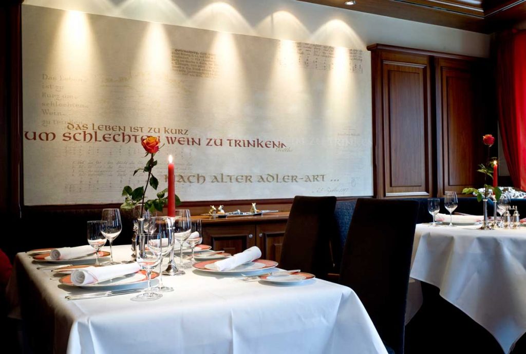 Hier erwarten Sie kulinarische Höchstleistungen, gehobene Tafelkultur und ein bestens geschulter Service. Helles, edles Zirbelholz ziert Wände und Decken des edel und liebevoll ausgestatteten Gourmetrestaurants. Die hohe Kunst der feinen klassisch-französischen Küche zeigt sich in den überaus gelungenen Gerichten von Harald Derfuß. Glänzen kann auch die fachmännisch zusammengestellte Weinkarte.