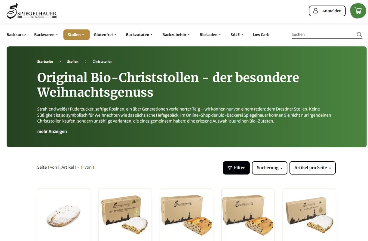 Die Bio-Bäckerei Spiegelhauer ist eine familiengeführte Handwerksbäckerei in Pirna und Lohmen, die den Fokus auf die Herstellung von Bio- und Demeter-Backwaren legt. In liebevoller Handarbeit wird hier alles von Brot und Brötchen über Kuchen bis hin zum traditionellen Dresdner Christstollen hergestellt. Im Shop findet man nicht nur das Original mit reinen Bio-Zutaten, sondern auch glutenfreie Stollen, ungezuckerte Varianten oder den weniger fettigen Dinkel-Christstollen.