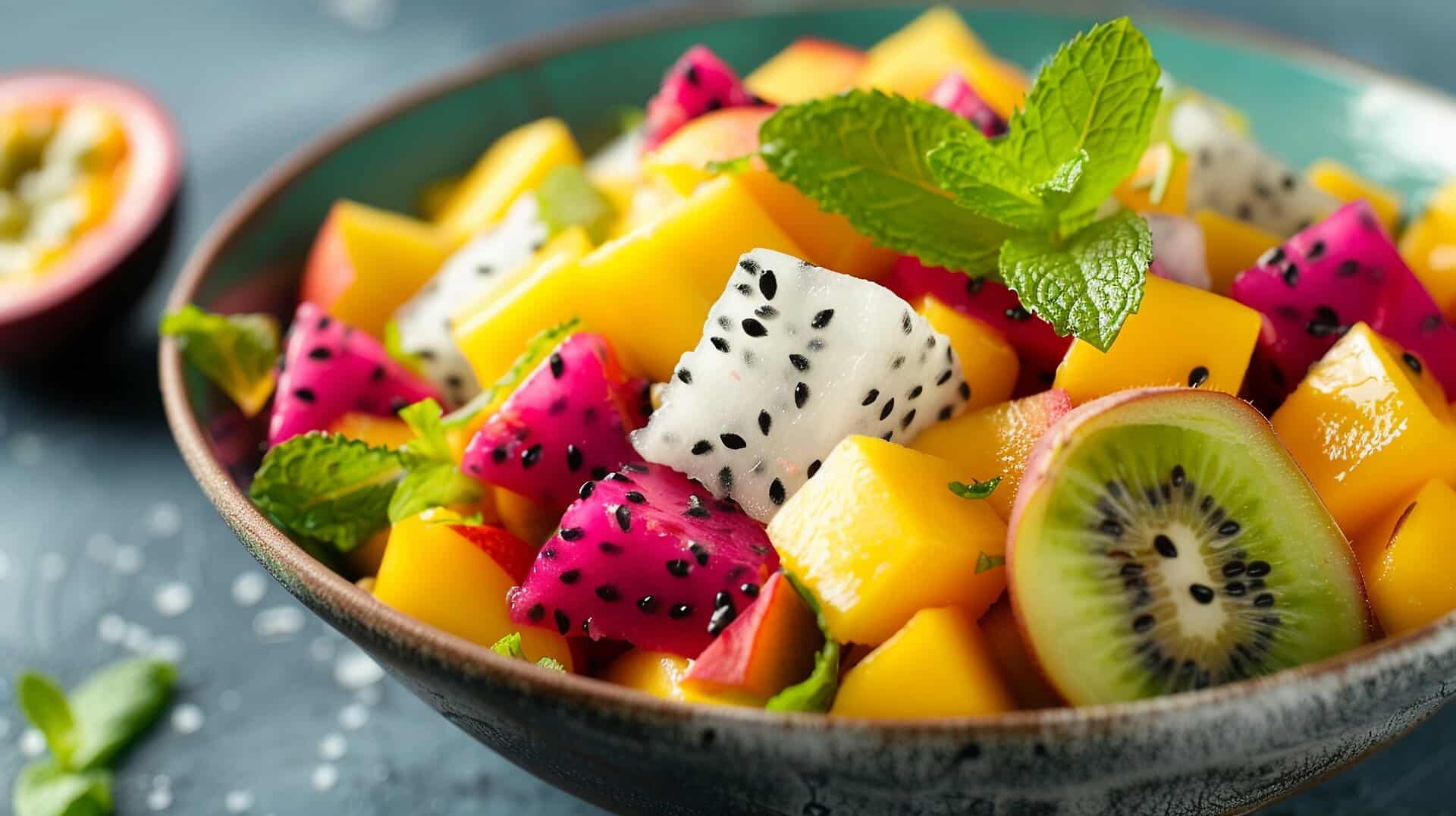 Wer sich bei kühlen Temperaturen und Schmuddelwetter den Sommer zurück in die eigenen vier Wände holen möchte, der kann sich mit einem exotischen Fruchtsalat Sonne und Urlaubsfeeling auf den Teller zaubern. Papaya, Ananas und Kiwi sorgen für den Vitaminboost in der dunklen Jahreszeit und bringen tropische Farbtupfer in den grauen Winteralltag. Getoppt wird das Ganze mit einer orientalischen Joghurtcreme.