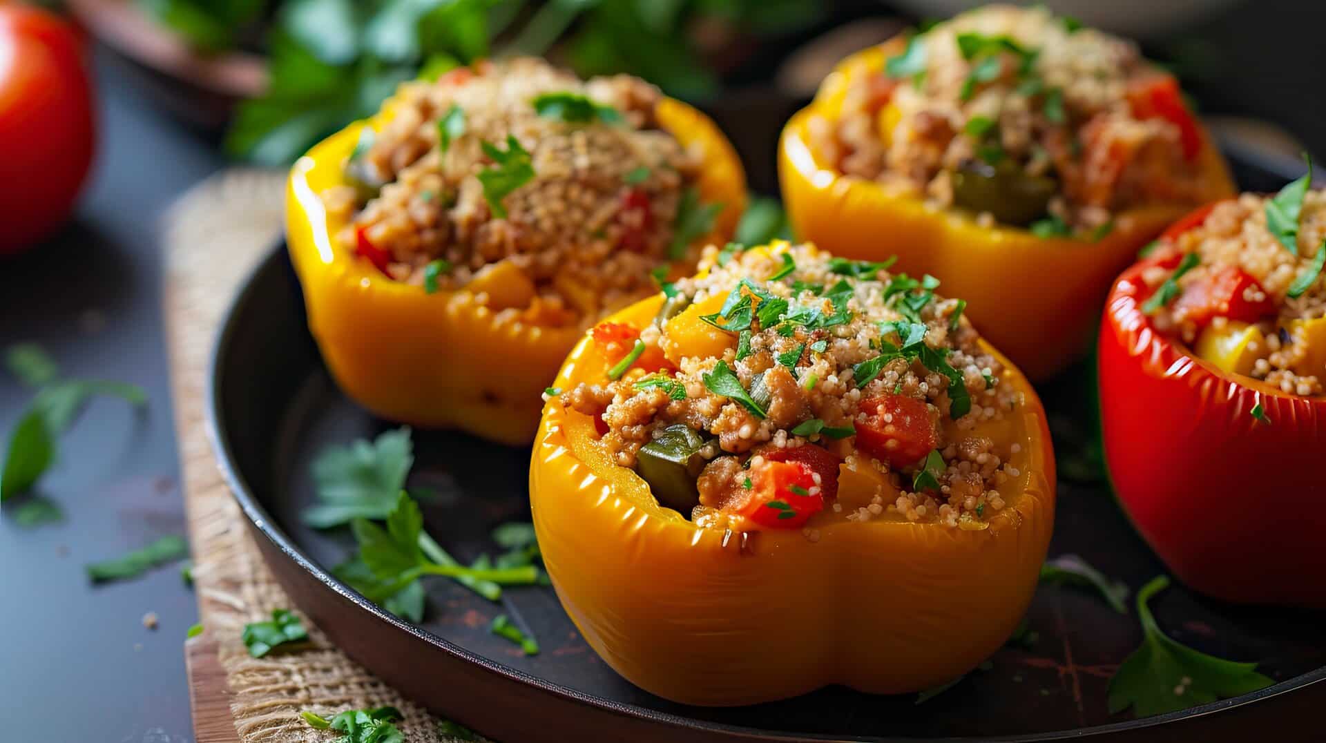 Gefüllte Paprika sind ein Klassiker der mediterranen Küche und werden meist mit Hackfleisch zubereitet – wer sich mal an einer vegetarischen Variante versuchen möchte, kann Couscous als Füllung probieren. Der Phantasie sind bei diesem Gericht keine Grenzen gesetzt – statt Couscous kann man für die Füllung auch Reis, Quinoa oder Dinkel verwenden, je nach Vorratsschrank und Gusto. Auch vegan zubereitet sind gefüllte Paprika eine gesunde Vitaminbombe in der kalten Jahreszeit!