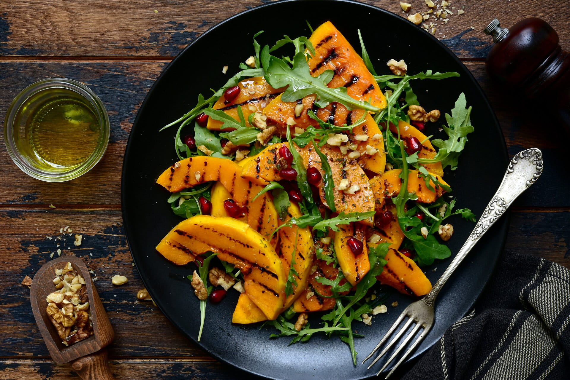 Salat geht auch im Winter – vor allem dann, wenn er vollgepackt ist mit heimischem Obst und Gemüse wie Kürbis, Ringelbete, Birne und Feldsalat. Für einen extra Farbtupfer sorgen frische Granatapfelkerne, und Walnüsse bringen den Crunch in den Salat – zudem sind sie als echtes „Brainfood“ gut fürs Gehirn. Kürbis darf im Herbst und Winter ohnehin nicht auf dem Speiseplan fehlen, und sein süßlich-leckerer Gescmack passt perfekt zu Bete und Feldsalat. Also ran an die Salatschüssel!