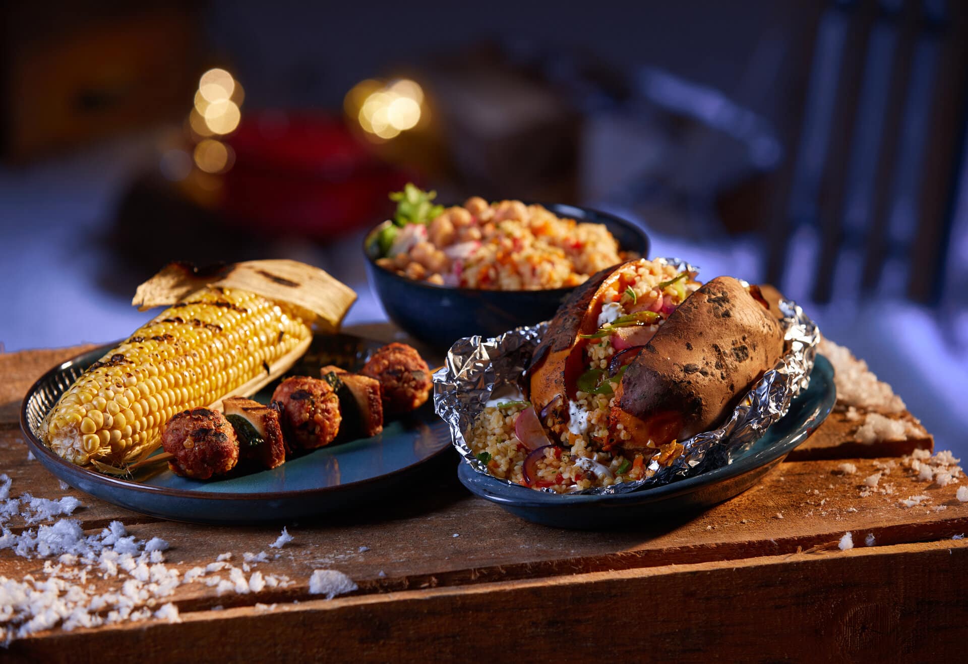 - Delicious grilled food on wooden table in backyard: © exclusive-design - stock.adobe.com