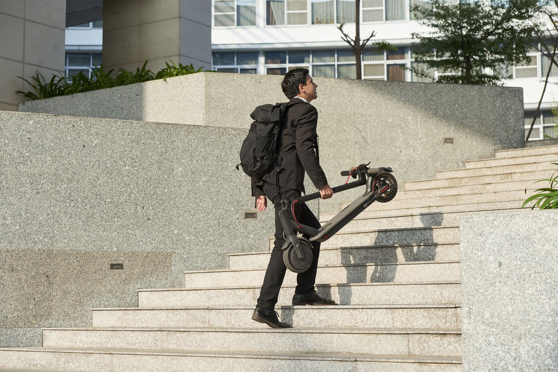 - Mann läuft treppauf mit zusammengeklapptem Scooter: © DragonImages - stock.adobe.com