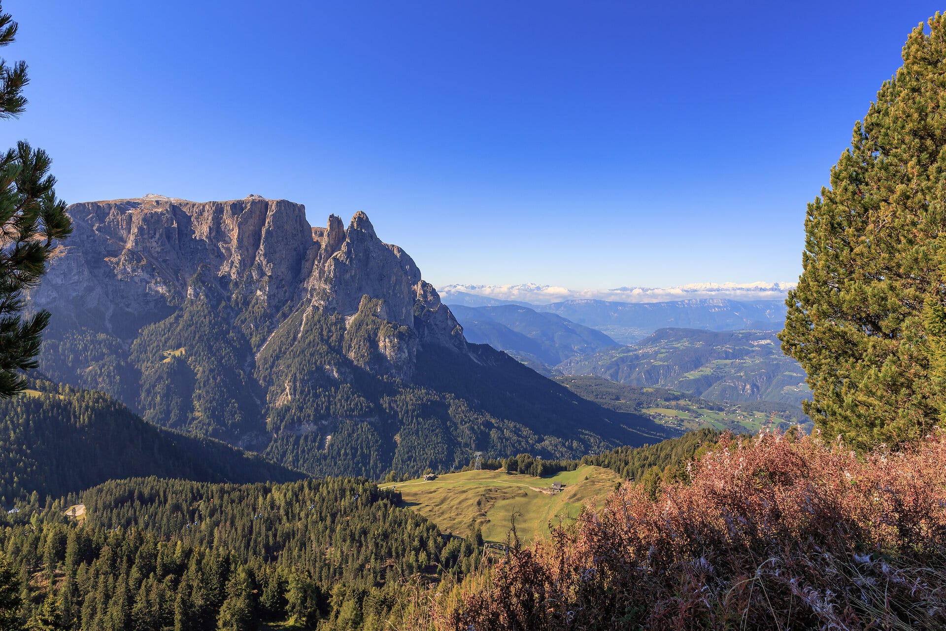 Eine der beliebtesten Touren führt von der Seiser Alm aus, Europas größter Hochalm, auf den Schlern. Starten Sie am Parkplatz Compatsch und folgen Sie dem gut ausgeschilderten Wanderweg. Zunächst geht es über sanfte Wiesen vorbei an urigen Almhütten, bis der Weg langsam steiler wird. Ab hier beginnt der eigentliche Aufstieg, der über Serpentinen durch lichten Wald führt.