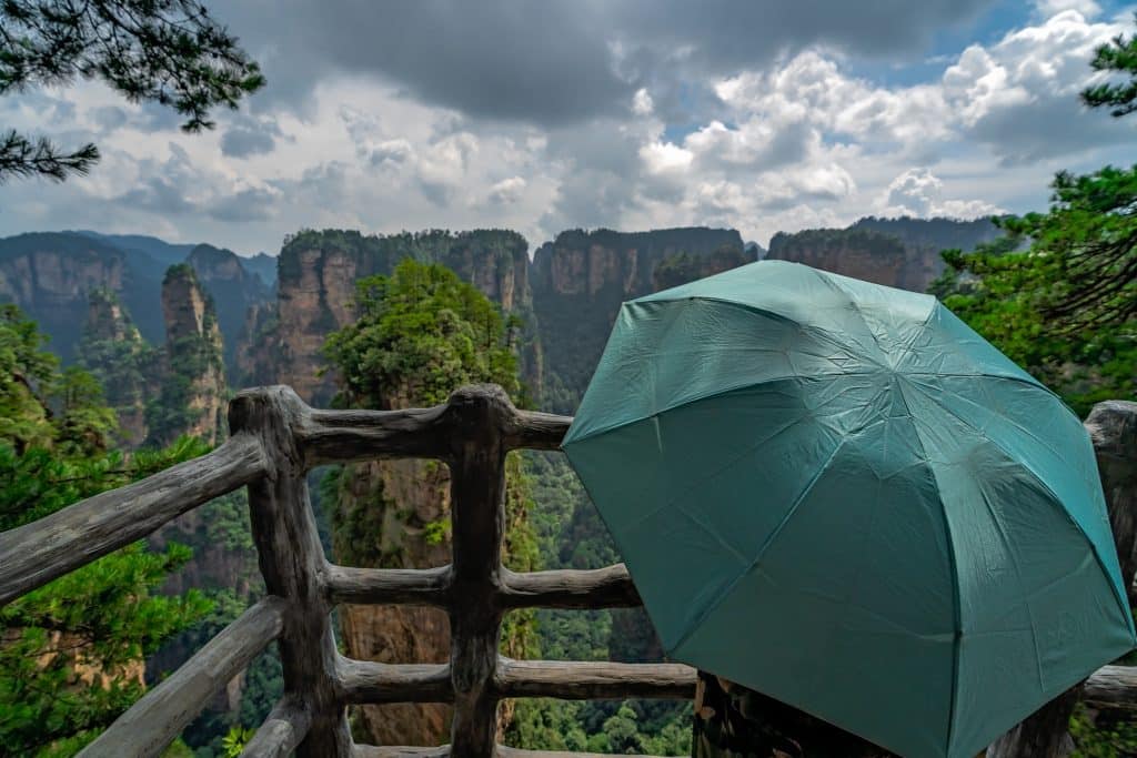 - Tourist mit Regenschirm an einem Aussichtspunkt in den Zhangjiajie-Bergen: © pawopa3336 - stock.adobe.com