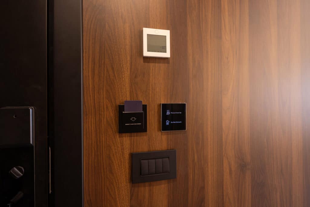 - Electronic door access and climate control on wooden hotel room wall: © rilueda - stock.adobe.com