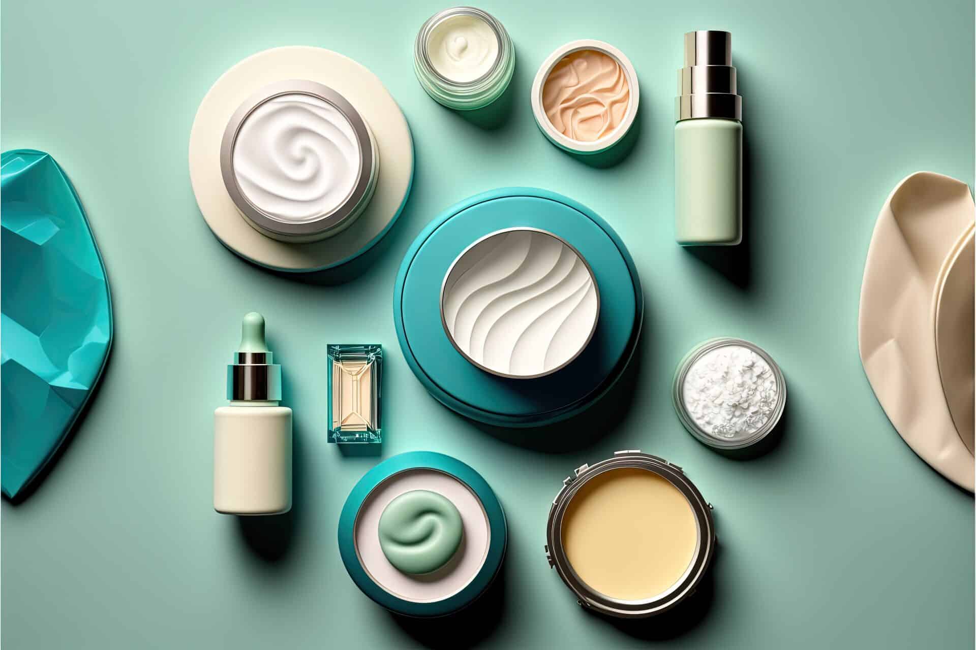 - a variety of cosmetics and makeup products on a blue surface with a blue bag and a blue bag on the side of the table, and a blue plate with a white lid and a blue.: © Anna - stock.adobe.com