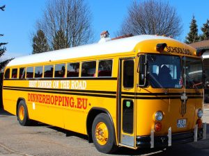 1. Dinnerhopping, München: In München kann man ein Dinner mit einer Stadtrundfahrt verbinden – und zwar in einem Original-Schulbus aus den USA. Der Schulbus stammt aus den 1970er Jahren und wurde liebevoll umgebaut und restauriert: die originalen Schulbussitze sind hochwertig gepolstert und mit Echtleder überzogen, zwischen zwei Stuhlreihen wurde je ein Original-Diner-Tisch aus den 1970ern montiert. Typische Neonleuchten dieser Zeit tauchen das Bus-Diner in ein authentisches Licht. Im Heck des Busses befindet sich eine US-Diner-Theke mit gekühlten Getränken.