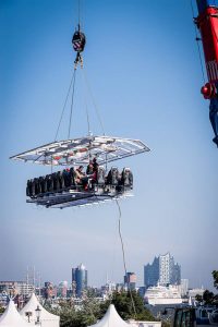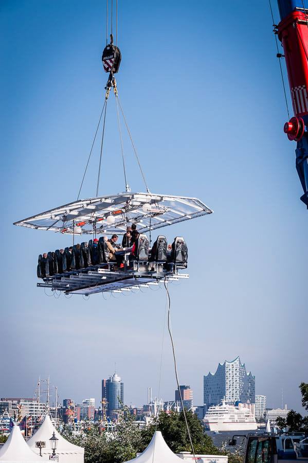 8. Dinner in the Sky: Diese Erlebnisgastronomie ist nichts für Menschen mit Höhenangst: beim Dinner in the Sky, das schon in vielen Städten auf der ganzen Welt zu Gast war, wird man auf einer mobilen Eventplattform 50 m in die Höhe gezogen und kann mit einem atemberaubenden Ausblick kulinarische Kreationen genießen. Man sitzt in Rennsport-Ledersitzen und ist über ein Mehrfachgurtsystem gesichert – dennoch wohl eher nichts für schwache Nerven!