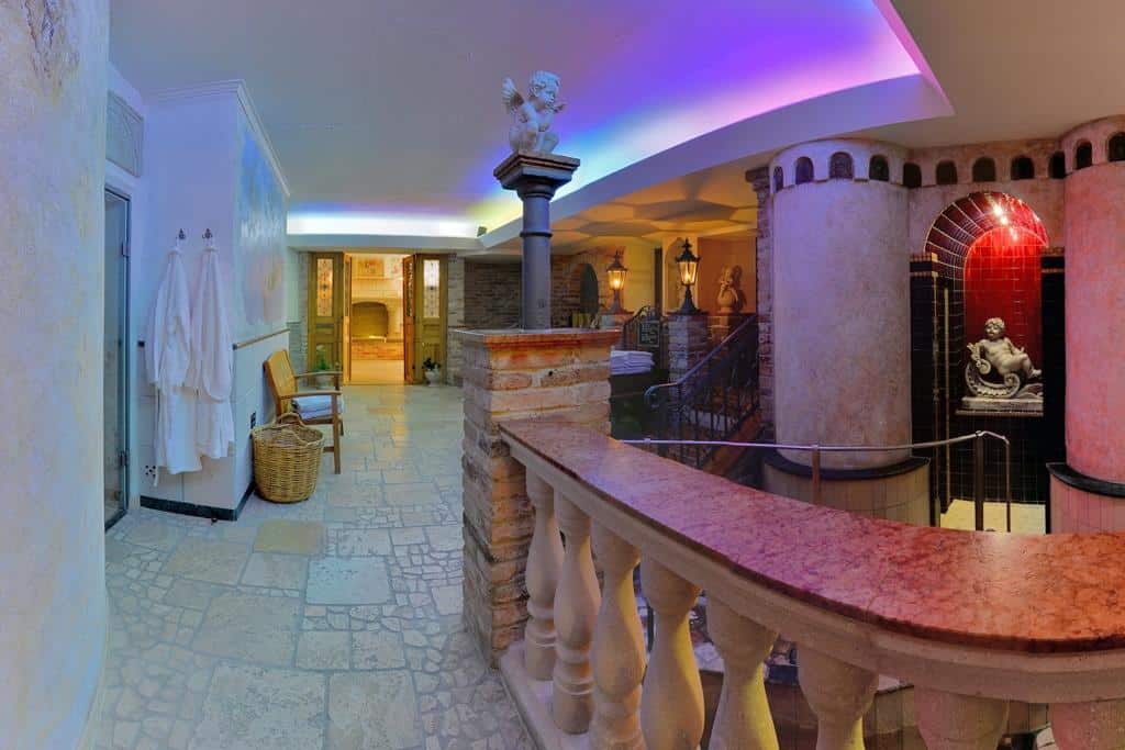 Unser Spa Palaestra ist ein Schmuckstück. Das Credo hier lautet ganz einfach: entspannen Sie sich! Auch zu entdecken gibt es Vieles – ob es kleine Engel, antike Tontafeln oder Wandmalereien sind, langweilig wird Ihnen hier sicher nicht. Auf 500 qm bietet Ihnen das Palaestra Entspannung, Erholung – und vor allem: viel Vergnügen! Vier Saunen halten wir für Sie bereit. Natürlich darf die aus dem Land der Saunaerfinder nicht fehlen: die finnische Hemlocksauna. Hier schwitzen Sie bei heißen 90 Grad. Wer es weniger hitzig mag, macht es sich lieber in unserem Dreiduft-Tecaldarium bequem – bei 45 Grad. Und anschließend vielleicht ins Aquamarin Dampfbad – oder doch in unsere Bio-Gewölbesauna? Die nötige Abkühlung können Sie sich im Tauchbecken, unter unseren Erlebnisduschen oder bei einem Spaziergang durch den Kneippbrunnen. Wagen Sie sich gerne auch nach Draußen – ein paar Stufen nach oben und Sie sind in unserem Entspannungsgarten. Oder erholen Sie sich im Rittersaal. Wer es gerne – vor der Entspannung – ein bisschen sportlicher mag, der hüpft einige Stufen nach oben in unser Hallenbad. Dort können Sie gerne einige Bahnen ziehen. Oder Sie wagen einen Abstecher in unseren Fitnessraum. Auf dem Laufband, dem Stepper, der Hantelbank oder dem Rudergerät lassen sich Muskeln stählen und Kalorien verbrennen.