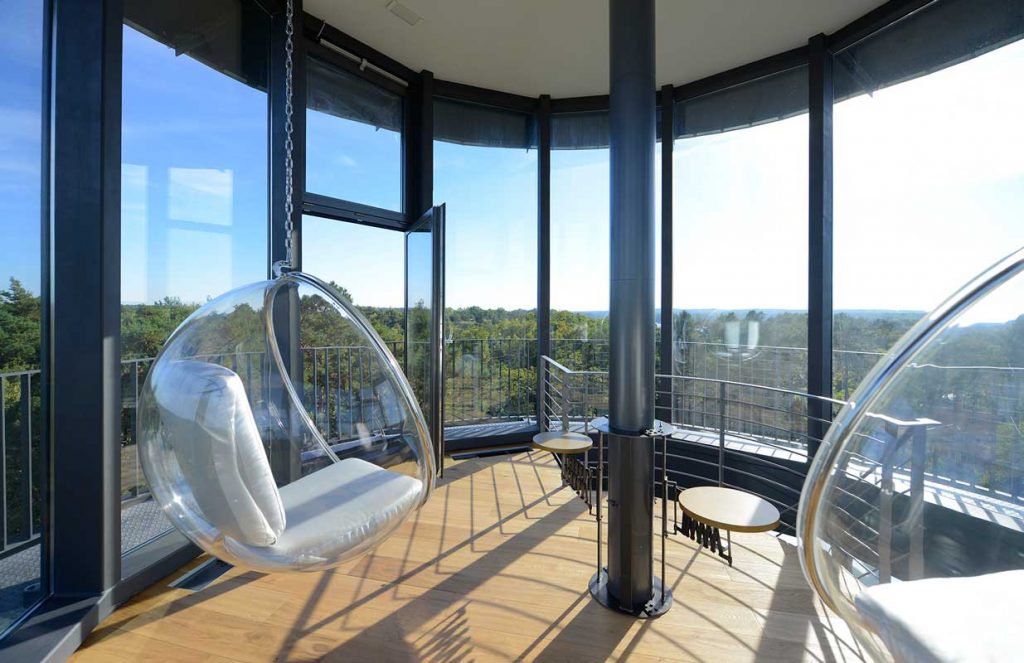 Das exklusive Minihotel in Bad Saarow ist mit allem ausgestattet, was man in ein paar Tagen Ruhe und Zurückgezogenheit brauchen könnte: Bademäntel, Hausschuhe, Handtücher, CDs, DVDs, Top-Hifi- und DVD-Equipment sind ebenso vorhanden wie Wasser, Espresso und Tee sowie Cremant, Champagner, Rot- und Weißwein in der Minibar. Im Erdgeschoss liegt das Bad, fünf Meter über dem Eingangsbereich befindet sich die Schlafebene mit rundem Bett. Darüber liegt der Wohnbereich auf etwa zehn Metern Höhe mit freihängendem Kamin. Den besten Blick hat man auf der Aussichtsplattform in 23 Metern Höhe: auf Bubble Chairs schweift hier der Blick über den Scharmützelsee, den Kurpark, die Therme und die brandenburgischen Wälder.