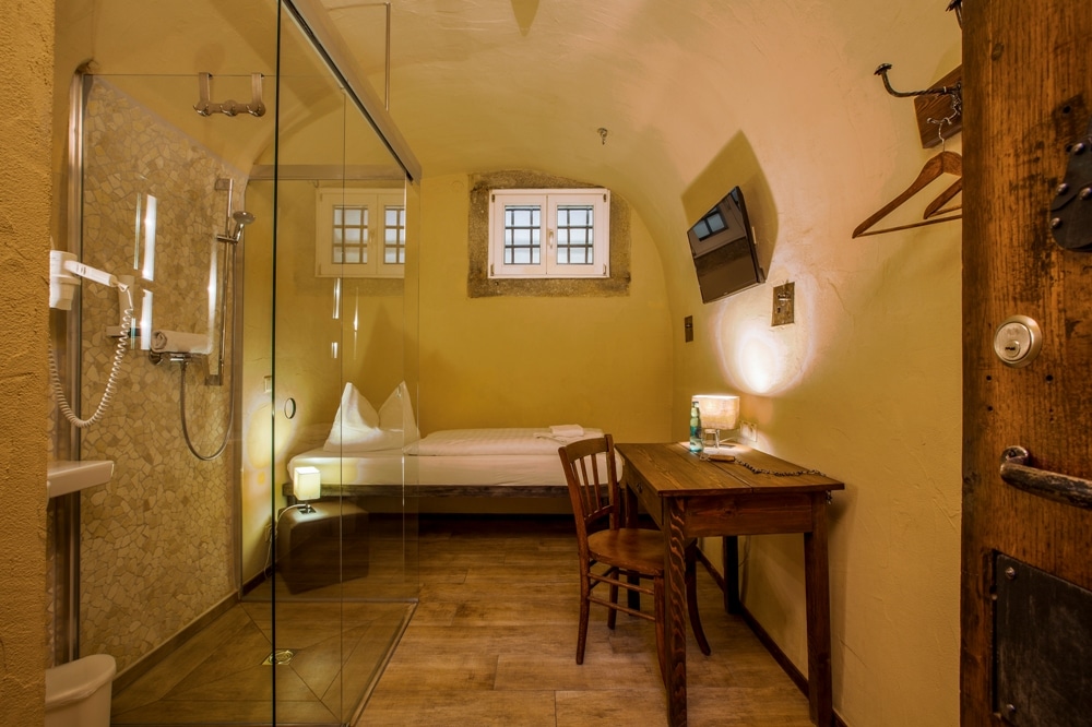 Regelmäßige Gäste kehrten bereits ab dem 17. Jahrhundert hier ein – doch niemals wurden sie so herzlich empfangen wie heute. Einst wurden Straftäter durch die Zellentüren aus dem Jahre 1699 geführt, meist an den Händen gefesselt, um einer peinlichen Befragung unterzogen zu werden – was zur damaligen Zeit nichts anderes bedeutete, als gefoltert zu werden. Wo einst Straftäter einsaßen oder der Eisenknecht wohnte, können Sie heute gemütliche Nächte hinter vergitterten Fenstern verbringen (die sich aber öffnen lassen), ein Frühstück am reichhaltigen Knastbuffet genießen und beim Freigang im Innenhof eine leckere Suppe schlürfen.