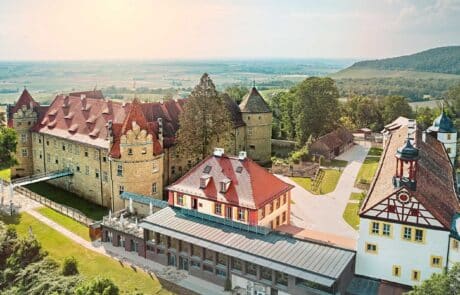 Ankommen. Aussteigen, tief durchatmen und dann – einfach nur schauen. Dieser Blick. Auf die sanft geschwungenen Hügel, auf die langen Reihen der Weinreben, auf die Wipfel des nahen Steigerwaldes. Ein Panorama, das neue Perspektiven schafft. Eine Aura, wie aus dem Märchen. Erhaben thront Schloss Frankenberg über dem lieblichen Tal. Die mittelalterlichen Türme strahlen Kraft und Schutz aus. Liebevoll restauriert und aus dem Dornröschenschlaf erweckt, wohnt den alten Mauern neuer Zauber inne.
