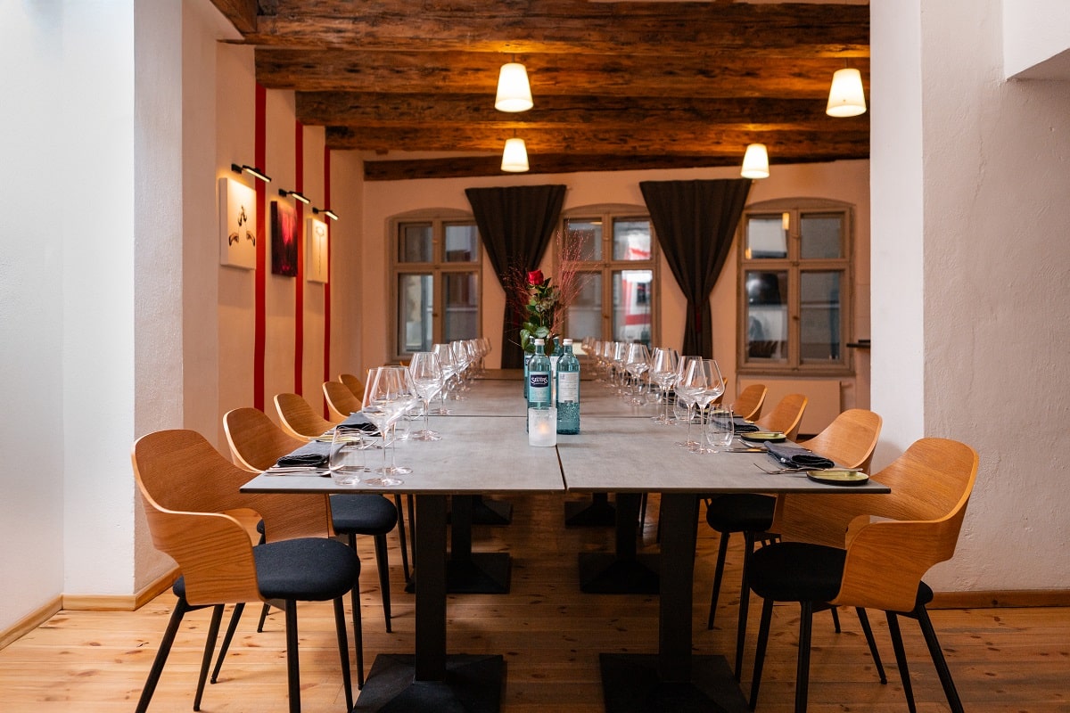 Die ruhige Atmosphäre unterstützt konzentriertes Arbeiten, während das stilvolle Ambiente für ein professionelles und zugleich angenehmes Umfeld sorgt. Für Businessevents stehen unterschiedliche Pauschalen zur Auswahl – von der stundenweisen Nutzung ab 29 € bis zur ganztägigen Miete ab 199 €. Auf Wunsch wird das Catering aus dem hauseigenen Restaurant integriert: leichte Lunchangebote, Kaffeepausen oder mehrgängige Businessdinner.