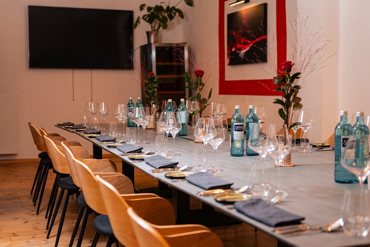 Auch für geschäftliche Anlässe bietet der Veranstaltungsraum des Weinlobbyisten optimale Bedingungen. Der Supperclub lässt sich als Tagungsraum, Meetingraum oder Seminarraum flexibel anpassen und ist mit moderner Technik ausgestattet. Dank WLAN, großem Bildschirm, Flipchart und optionalem Moderationskoffer ist der Raum ideal für Workshops, Schulungen oder Präsentationen geeignet.