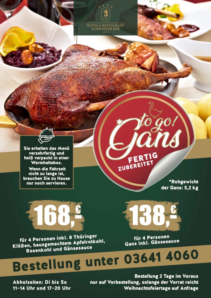 Stressfrei ein Festessen auf den Tisch zaubern? Genießen Sie ein Festessen im Kreise der Familie oder Freunde mit unserem traditionellen Gänse-Menü: ein knuspriger Gänsebraten, dazu Thüringer Klöße, Rotkohl und Rosenkohl für 4 Personen. Das Menü ist frisch gekocht, servierfertig und warm verpackt – Sie müssen es nur noch abholen und genießen. Wir wünschen Ihnen einen guten Appetit!