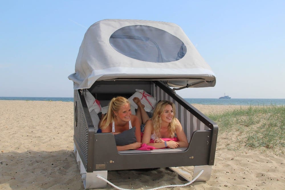 Die Idee aus der beliebten Sitzgelegenheit an Nord- und Ostsee ein Urlaubsdomizil zu machen, entstand übrigens im Rahmen der Initiative »Glückswachstumsgebiet« der Tourismus-Agentur Schleswig-Holstein (TA.SH) mit ihren Partnern der Stiftung Mensch, dem Ostsee-Holstein-Tourismus e.V. sowie der Designagentur Feldmann und Schultchen. Mit Erfolg: Der Schlafstrandkorb „Made in Schleswig-Holstein“ sicherte sich 2016 den Deutschen Tourismuspreis. Anfang März 2017 kam auf der Internationalen Tourismus-Börse (ITB) in Berlin die Goldene Palme für die beste Innovation der Reisebranche hinzu. Produziert werden die Schlafstrandkörbe von Hand in der Strandkorbmanufaktur der »Stiftung Mensch« in Meldorf im Kreis Dithmarschen von Menschen mit Behinderung.