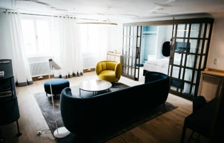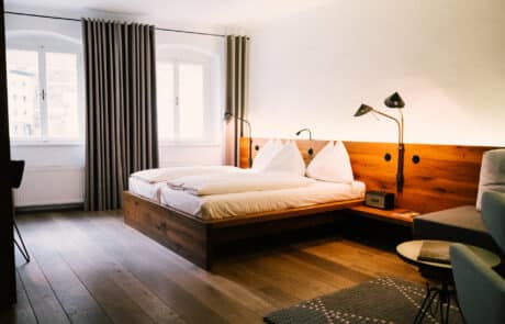 Der rechte Winkel ist im Haus Mangelware, die Zimmer haben alle einen unterschiedlichen Zuschnitt, und die Wände sind windschief und bauchig. Hotelware von der Stange ist hier nicht möglich – stattdessen steht Handwerkskunst im Vordergrund: solide Tischlerarbeit, gegossene Betonfliesen, Kastenfenster und sorgfältig verlegte Steinböden. Möbel von Moroso, MDF Italia, Fredericia und Eigenentwürfe. Armaturen von Zucchetti und Dornbracht. Die Leuchten wurden von Architekt Christian Prasser entworfen und von 2f gebaut. Licht in die Sache bringen außerdem Artemide, Flos, Axel Meise Licht und Foscarini.