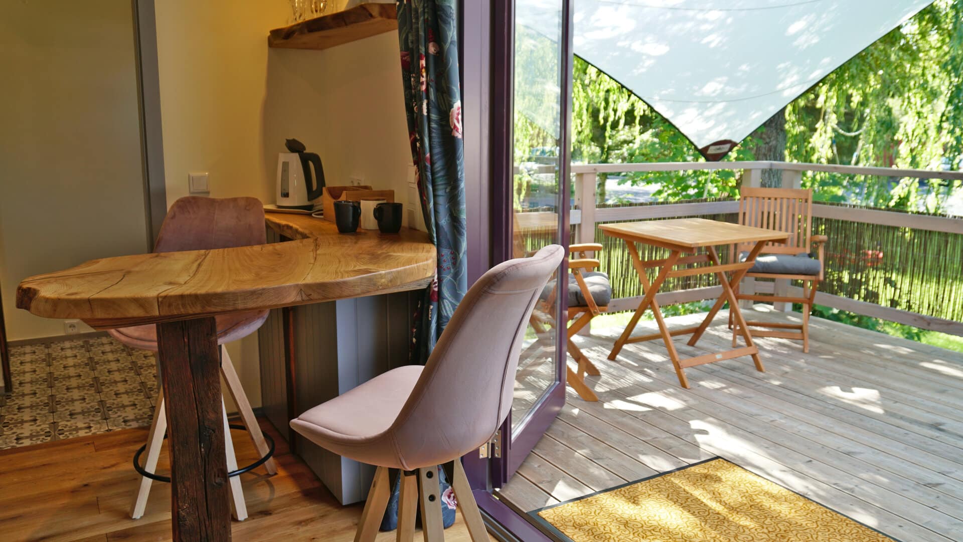 Alle Zirkuswagen im NaturNah Hotel sind aus natürlichen Baustoffen gefertigt und stehen auf einem ruhigen Rasengrundstück mit einer schönen Weide als Mittelpunkt – perfekt zum Entspannen und Entschleunigen mitten in der Natur. Ausgestatte sind die Wagen mit einem großen, gemütlichen Doppelbett mit Federkernmatratze, zwei gemütlichen 60er-Jahre-Sesseln, handgetischlerten Massivholzmöbeln und Holzdielenböden mit Geschichte, Badezimmer mit WC und Dusche, Handtüchern, Haartrockner, WLAN, einer Elektroheizung sowie einer kleinen Küchenzeile mit Wasserkocher, Kaffee- und Teeangebot und Kühlschrank.