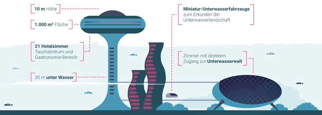 Wenn wir einen Blick in die Zukunft der Unterwasserhotels werfen, wird es ganz besonders spektakulär. Noch ist nicht klar, wann das vom Deep Ocean Technology designte Water Discus Hotel in Dubai für die Öffentlichkeit zugänglich gemacht werden kann. Wenn es fertig ist, soll es 21 Luxus-Suites bieten, die oberhalb und unterhalb des Meeresspiegels verteilt sind. Geplant sind außerdem eine Bar unter Wasser sowie – wie soll es auch anders sein – ein Tauchzentrum. Durch das innovative, raumschiffartige Design mit einzelnen Modulen, die abgetrennt und durch neue ersetzt werden können, kann das Water Discus Hotel auch zu einem größeren Resortkomplex ausgebaut und weltweit rekonstruiert werden. Die spezielle Beleuchtung und eine Zoom-Technologie ermöglichen es den Gästen, die Unterwasserwelt quasi in HD zu bestaunen.