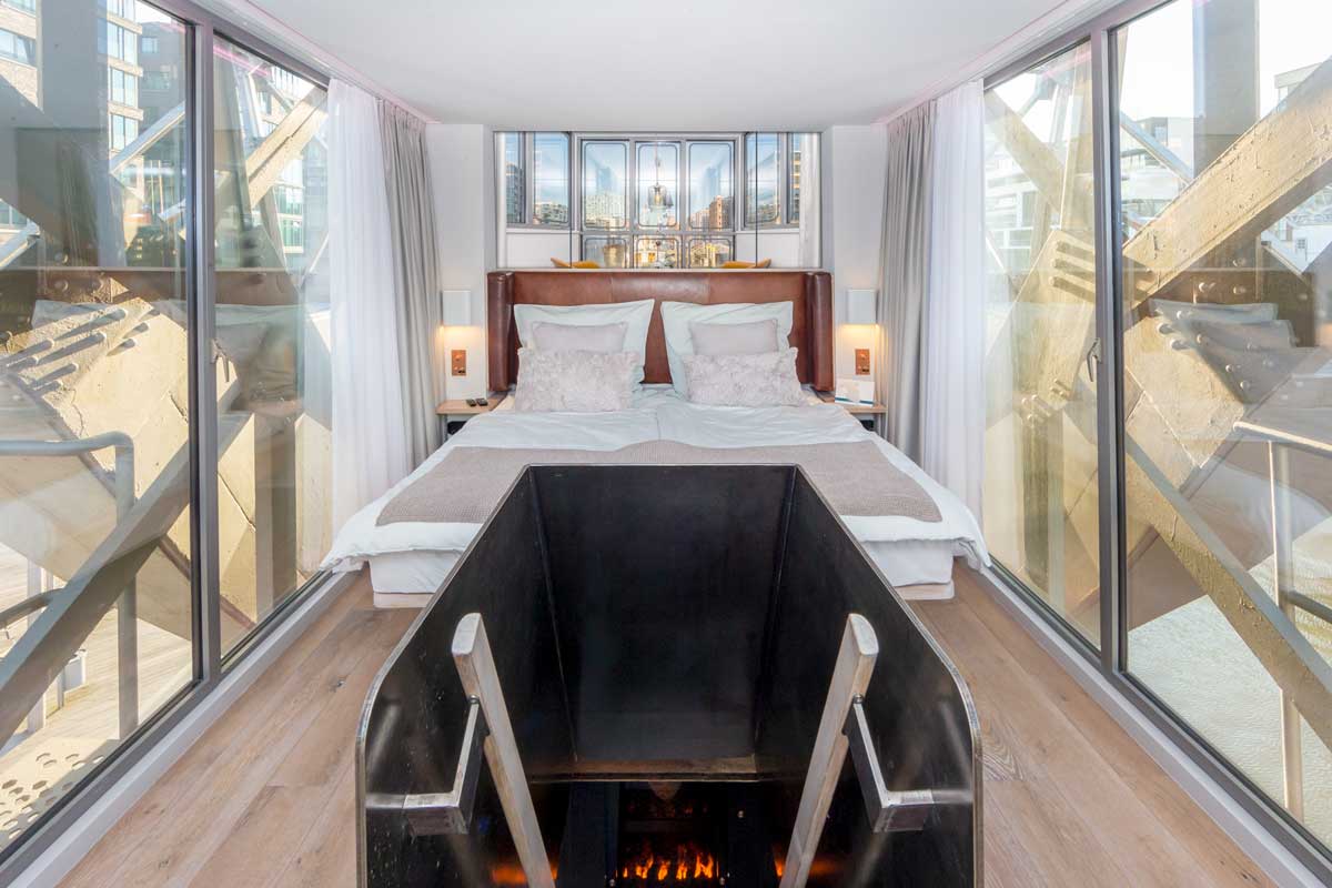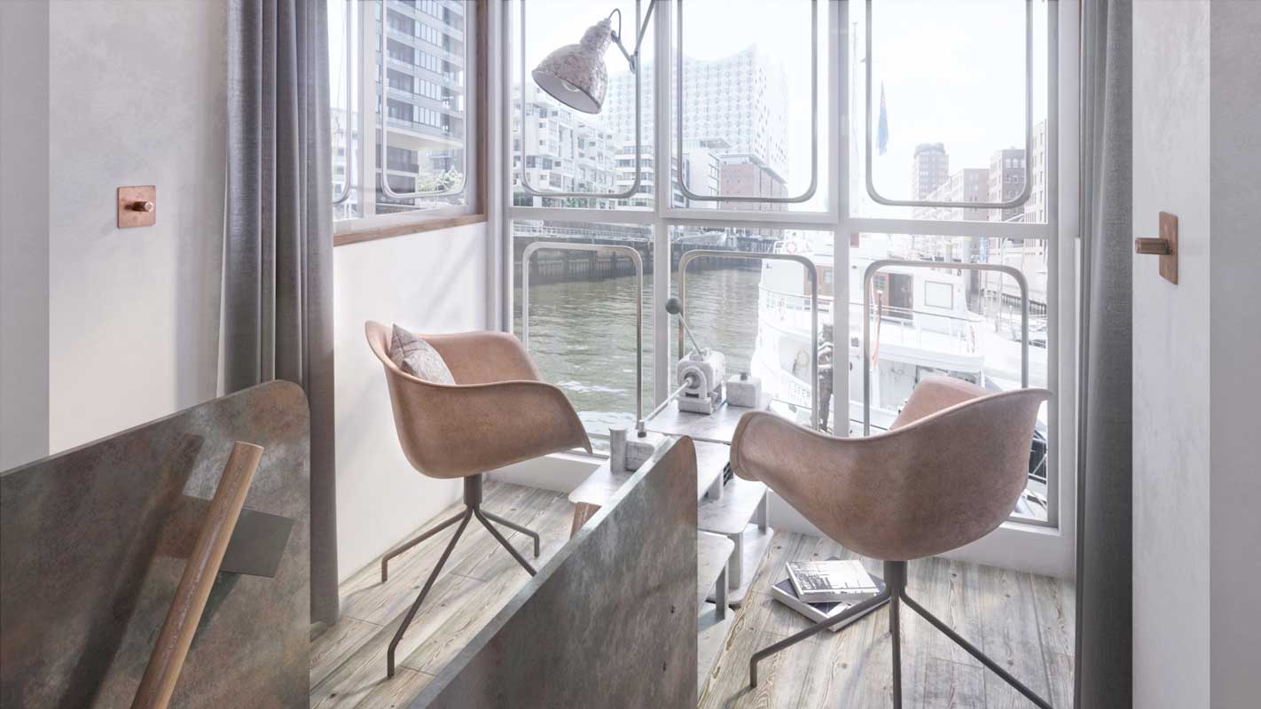 Der Hafenkran Hamburg ist kein Luxushotel, es gibt keine Lobby und keinen Liftboy, und trotzdem hat man hier alles, was man für eine außergewöhnliche Übernachtung braucht. Der Stil ist schlicht, maritim und manchmal recht besonders, die Ausstattung ist funktionell, durchdacht und fast jedes Stück ist ein Unikat. Der Kran bietet Schlafen in Shuj-Seide, eine Erlebnisdusche mit Kamin, HiFi, DVD mit Kult-Film-Selektion, eine Espresso-/Tee-Bar, Handtücher, Bademäntel sowie eine Mini-Bar mit Weinselektion. Über eine schmale Treppe erreicht man das Schlafzimmer im zweiten Stock: hier hat einst der Kranführer die Hände am Schalthebel gehabt, darum auch die grandiose Rundumsicht auf Museumsschiffe und Elbphilharmonie. Das Frühstück wird auf dem unteren Deck zubereitet und persönlich serviert – einnehmen kann man es beispielsweise auf der Terrasse mit Blick auf die Elbphilharmonie.