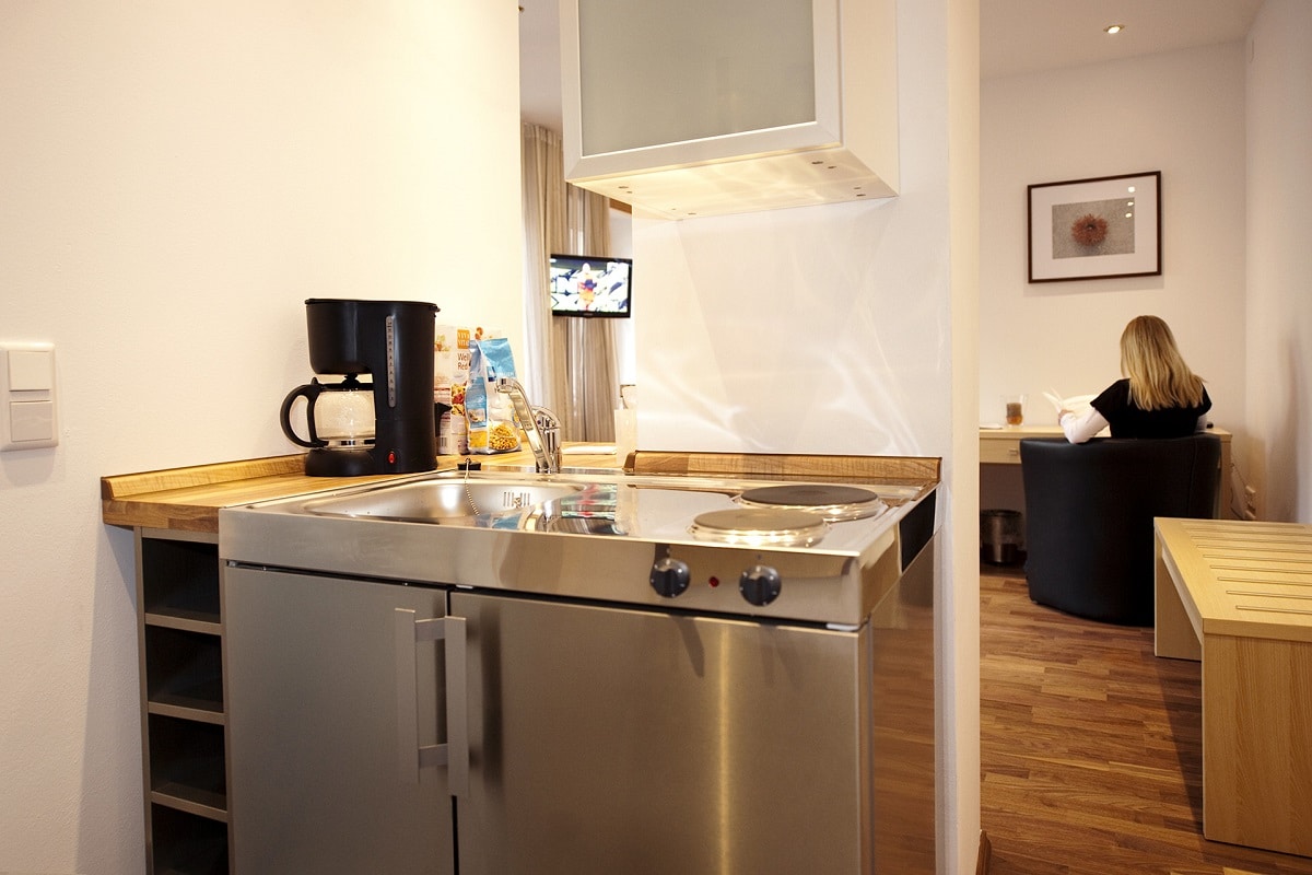 Seit 1993 bietet das Hotel Advantage in Nürnberg neben komfortablen Einzel- und Doppelzimmern auch funktionell eingerichtete Hotel-Apartments. Das Hotel befindet sich in einer ruhigen Seitenstraße, ca. 7 Gehminuten vom Hauptbahnhof und von der Nürnberger Altstadt entfernt. Die Messe erreicht man von hier in wenigen Minuten mit der U-Bahn. Wer es bei einem Businesstermin oder einem Urlaub in Nürnberg etwas komfortabler haben möchte, der ist im Hotel Advantage richtig. Die Serviced Apartments wurden speziell für Langzeitgäste konzipiert, geplant, eingerichtet und ausgestattet. Eine ruhige Lage, ineinander übergehende Räume, Komfortduschbäder, abgeschirmte Schlafbereiche mit großen Komfortbetten und für Selbstversorger ausgestattete Singleküchen sind die Vorzüge der Serviced Apartments im Hotel Advantage. Richtig wohlfühlen kann man sich im Penthouse: Hier stehen eine zeitlos moderne Möblierung, eine große Komfortküche samt Bar- und Frühstückstheke sowie ein eigenes Wellnessbad für Langzeitgäste zur Verfügung.