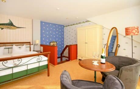 Das Hotel Nautilus auf Rügen verfügt sowohl über maritim als auch modern eingerichtete Hotelzimmer. Wer sich ganz auf das besondere Erlebnis einlassen will, der nächtigt in Kapitänssuiten oder Kapitänszimmern, die passend zum U-Boot gestaltet sind – natürlich nicht so eng und spartanisch ausgestattet wie die Kajüten der Nautilus-Mannschaft, sondern modern und großzügig. Die Kapitänssuiten befinden sich in 2 Gästehäusern und sind über die einzelnen Terrassentüren separat von außen zu begehen. Parterre befinden sich das Wohnzimmer und das Bad, über eine Holztreppe geht es in den Schlafbereich. Dank dem einmaligen Design, das den maritimen Charakter des Hotels auf Rügen auf unverwechselbare Weise unterstreicht, fühlt man sich wie im U-Boot der Nautilus, ohne auf den Komfort einer modernen Unterkunft verzichten zu müssen.