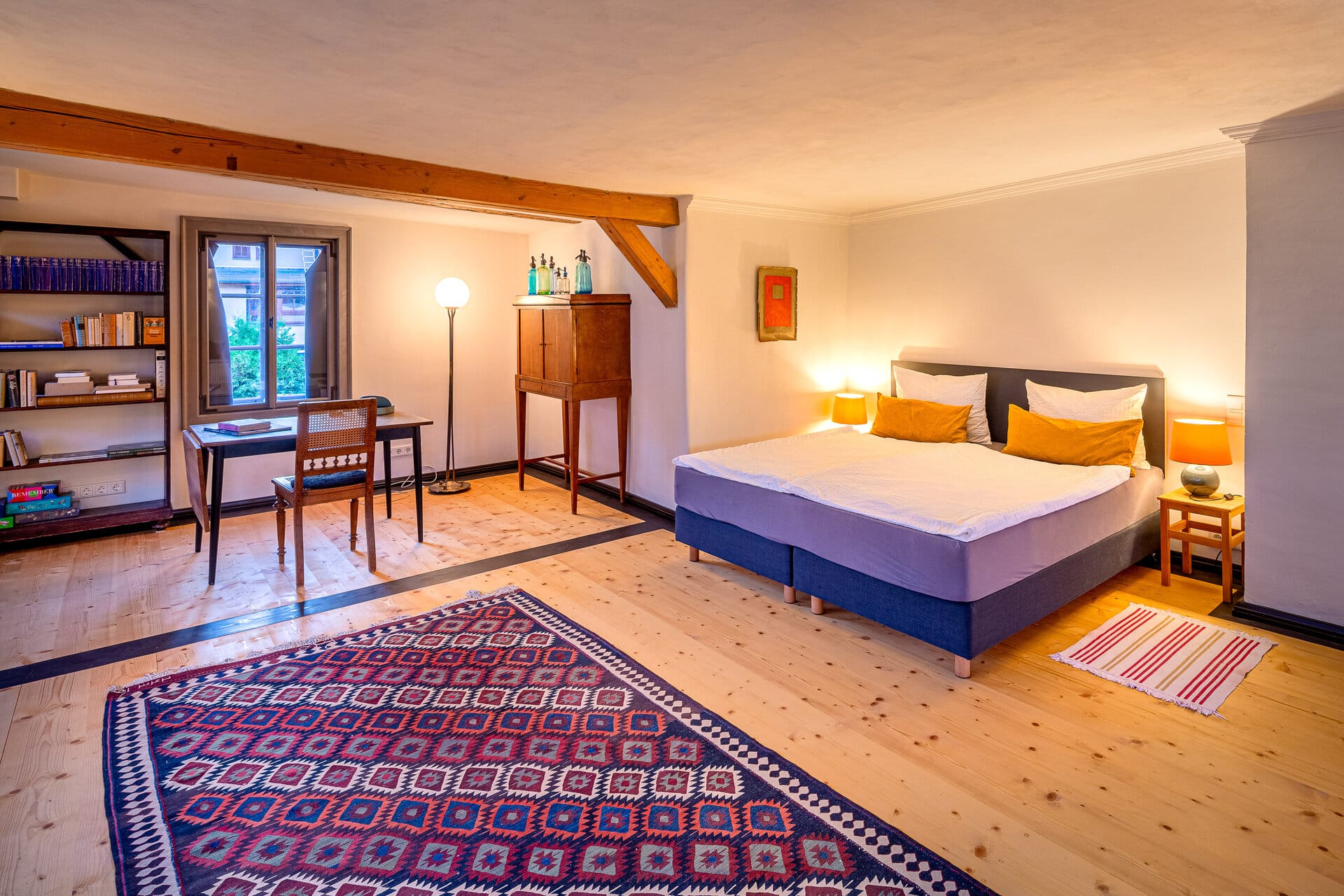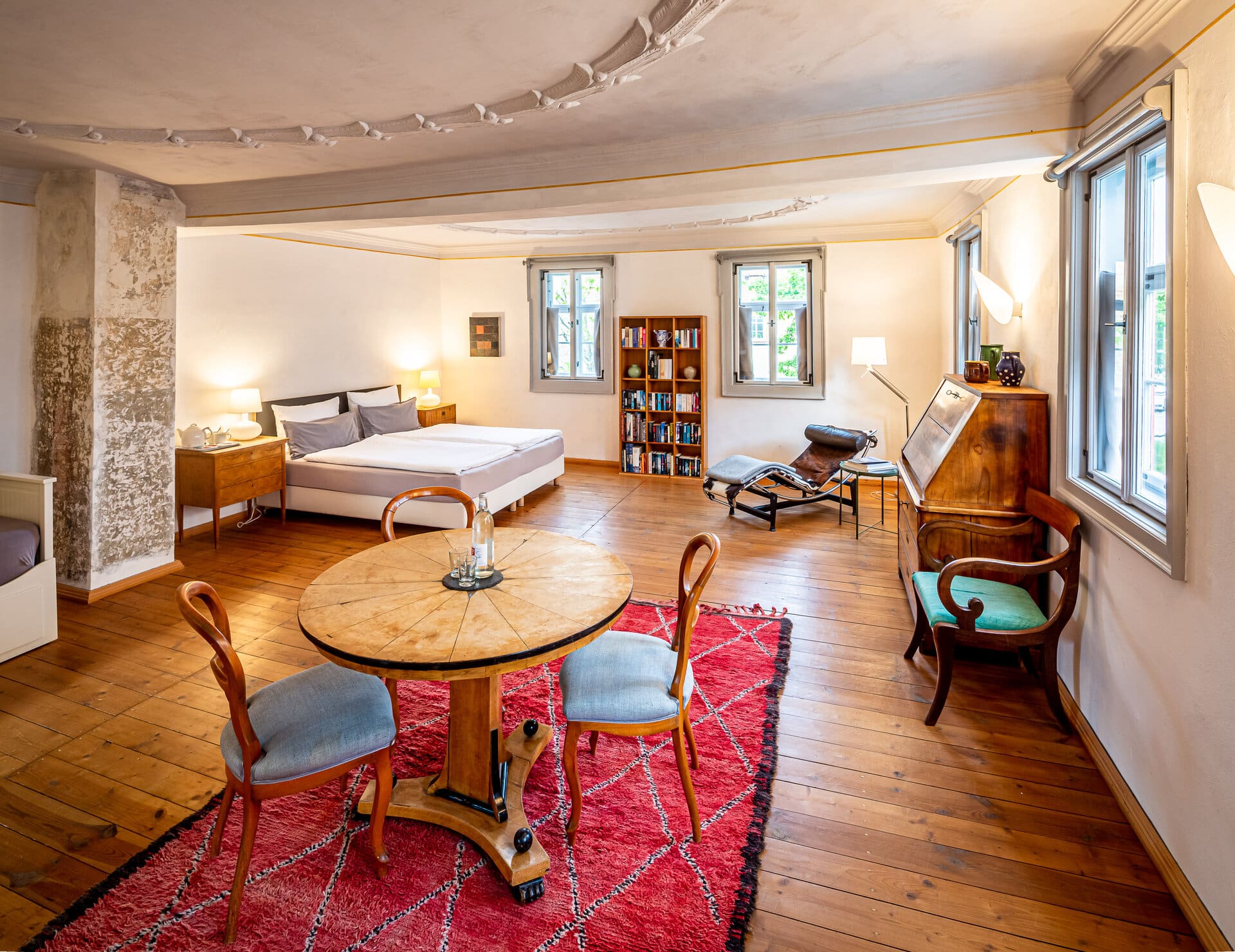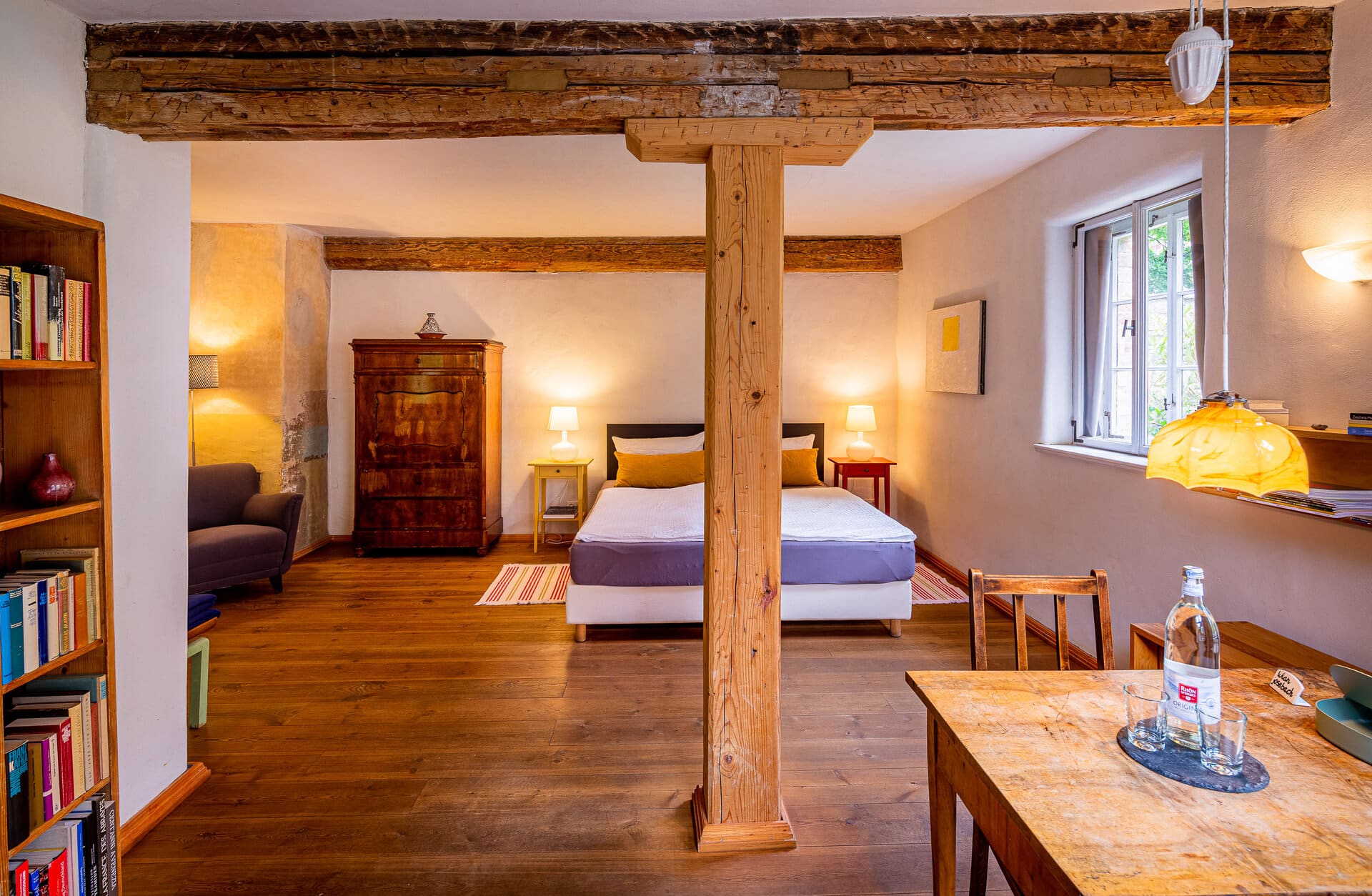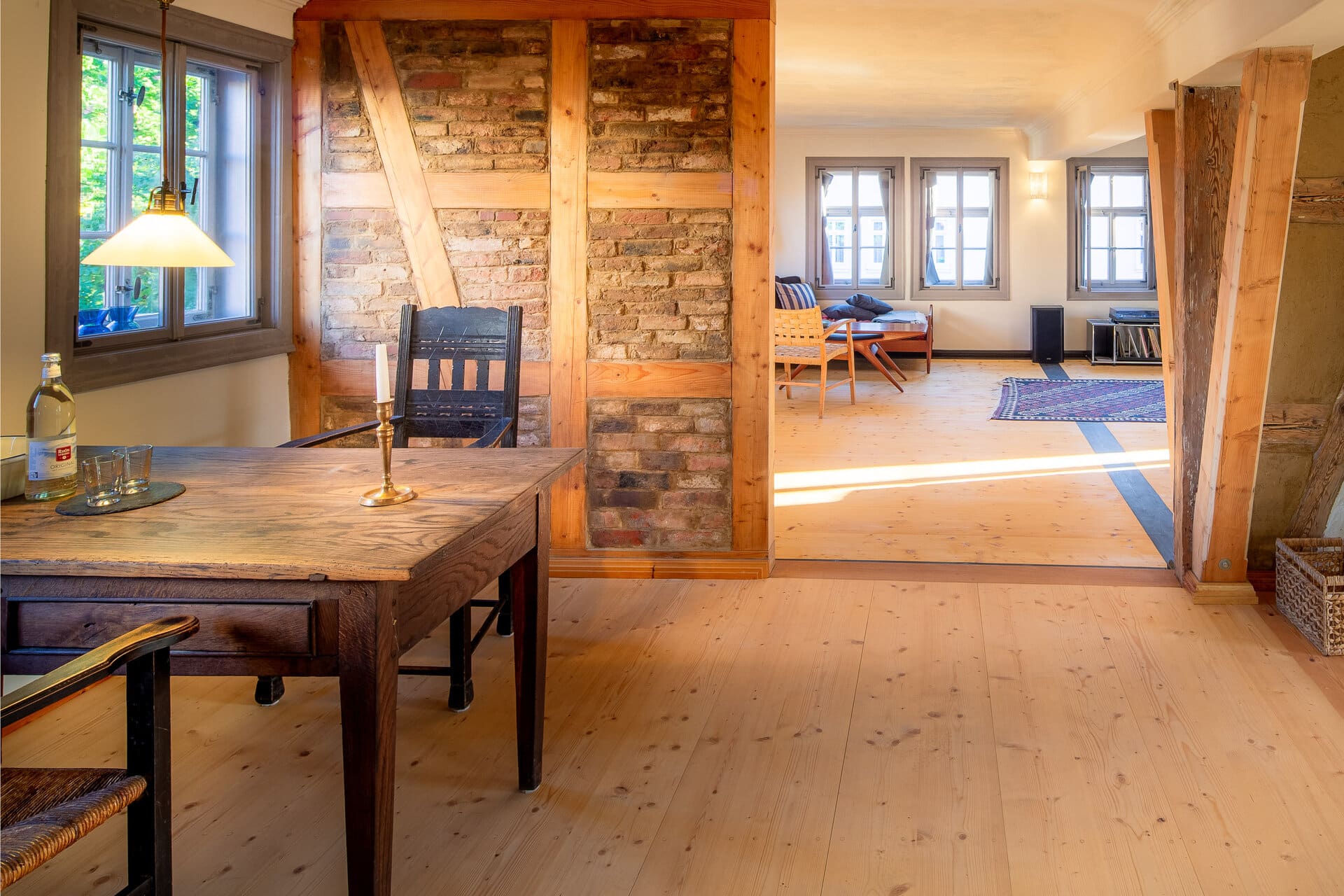 Die Ferienwohnung im Fachwerkhaus bietet einen Wohn-, Schlaf und Arbeitsbereich mit Bibliothek und Plattenspieler sowie einen Essbereich mit vollwertig ausgestatteter Küche – beide Raumteile sind durch einen offenen Durchgang miteinander verbunden. Hier wohnt man inmitten historischer Möbel auf echtem Holzboden, zwölf historische Kastenfenster sorgen für Licht und Sonne. Etwas Besonderes ist das Loft-Apartment im Fabrikgebäude: Hier war bis 1991 der Nähsaal der Handschuhmanufaktur Julius Möller Arnstadt untergebracht. Davon zeugen heute noch vier Meter Deckenhöhe und die großen Fenster, die eine Belichtung von allen Seiten ermöglichen. Der Raum ist Wohnen, Kochen und Essen, Tagungen und Workshops, der Kunst, der Musik und Literatur gewidmet.