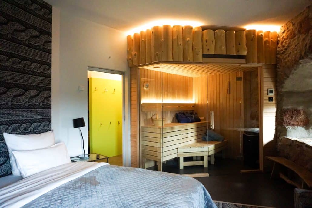Die stilvoll eingerichtete Turm-Suite im Erdgeschoss ist insgesamt ca. 48m² groß und richtet sich z.B. an Paare oder Familien mit zwei Kindern, die zusammen Urlaub machen und jeweils ein eigenes Schlafzimmer möchten. Das Bett im klimatisierten Schlafzimmer wird vom indirekten Licht der Sauna romantisch beleuchtet. Der Dusch & WC- Bereich ist vom Flur aus erreichbar. Im vorderen Zimmer steht die moderne Wohnküche mit gemütlichem Sitzbereich für das wohlige Beisammensein. Auf dem Sofabett schläft man gemütlich.