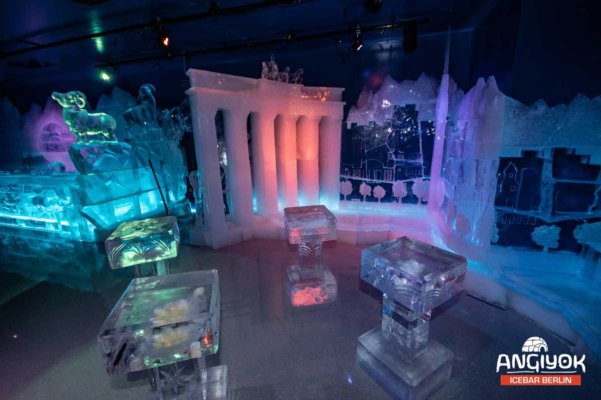 Die Idee für eine Eisbar in Berlin kam Geschäftsführer Thilo J. von Beyme bereits vor über 20 Jahren, als er in Neuseeland weilte und die Schlangen an Leuten sah, die in einer Eisbar in Auckland um Einlass begehrten. Nahe dem Berliner Dom ist die Idee jetzt Wirklichkeit geworden – 60 Tonnen Eis, eingebettet in ein großes Kühlhaus, sorgen im Angiyok für frische minus zehn Grad. Wärmende Capes und Handschuhe werden in der Lounge an die Gäste ausgegeben – und dann geht es hinein in die einzigartige Eiswelt. Künstler aus aller Welt haben hier beeindruckende Eisskulpturen geschaffen – unter anderem den Berliner Bären, das Brandenburger Tor, die Berliner Mauer, einen Schlitten sowie Tischchen mit schwerelos schwimmenden Seerosen und Seelöwen. Alle Skulpturen sind mit wechselnden Farben beleuchtet und sorgen so für magisches Flair.
