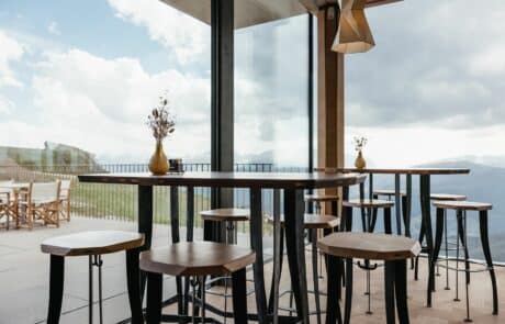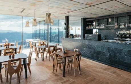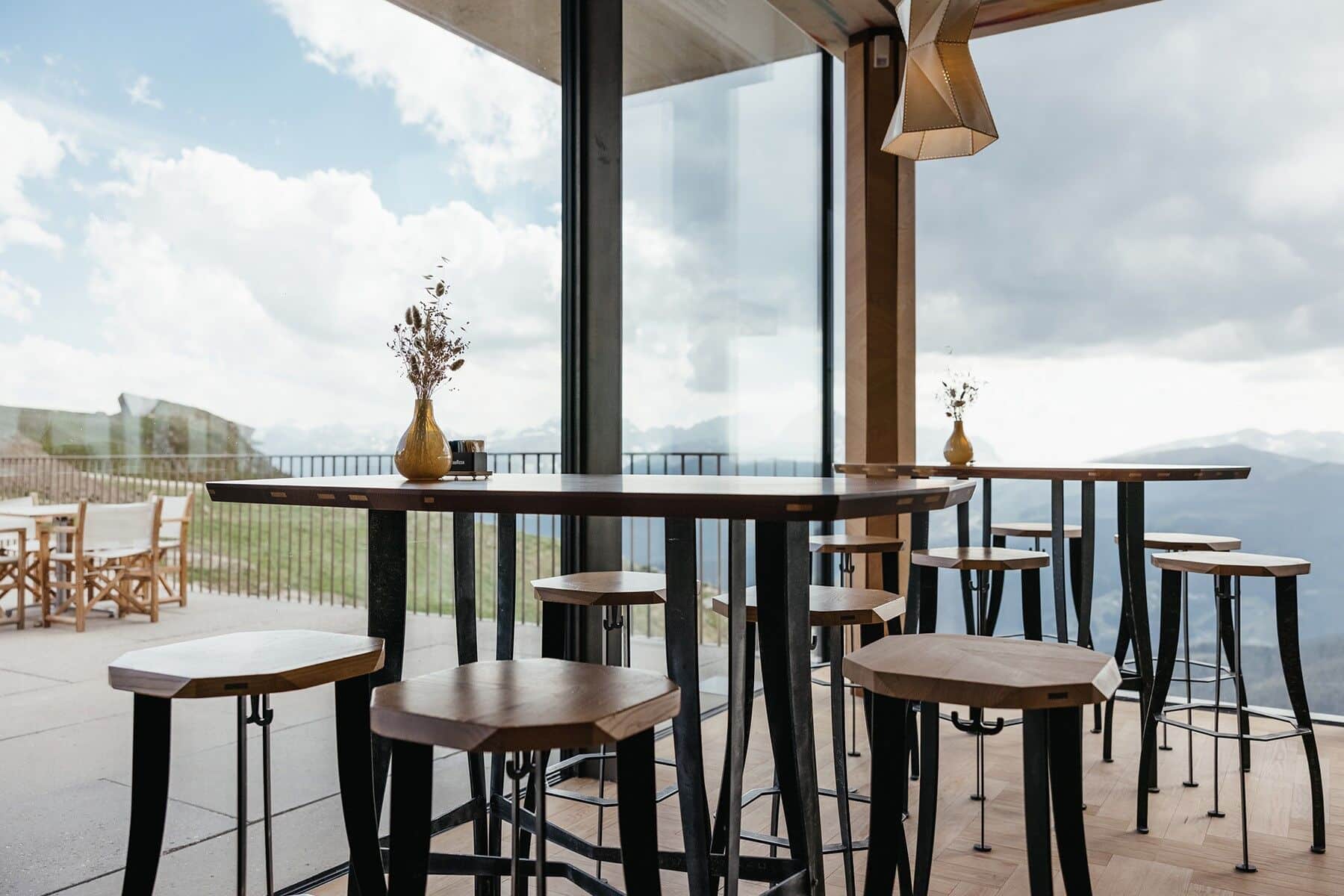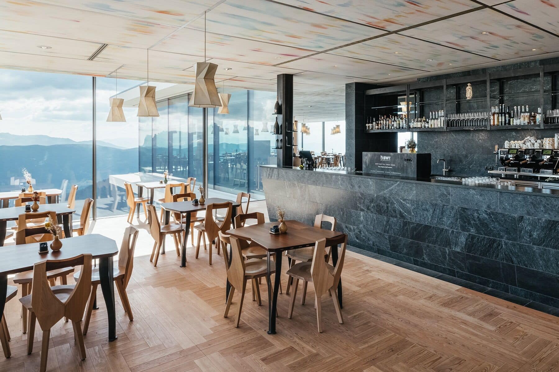 Die Innenräume des Restaurants sind n Form eines “Living Room” vom international anerkannten Südtiroler Designer Martino Gamper gestaltet – hier trifft man sich, isst, trinkt und genießt den Ausblick auf die Berge. Verschiedene Formen und Materialien ergänzen sich gegenseitig und schaffen eine intime und einladende Atmosphäre. Auf dem Gipfel des Kronplatzes im Herzen der Südtiroler Dolomiten erlebt man hier zu jeder Jahreszeit eine spektakuläre Aussicht auf unberührte Natur und die sagenhafte Schönheit der Bergwelt. Angeschlossen an das Restaurant ist das LUMEN, das 1.800 qm große Museum für Bergfotografie, das historische Fotografien und digitale Innovationen, spannende Wechselausstellungen und spektakuläre Werke präsentiert, die das Motiv “Berg” aus verschiedenen Perspektiven beleuchten.