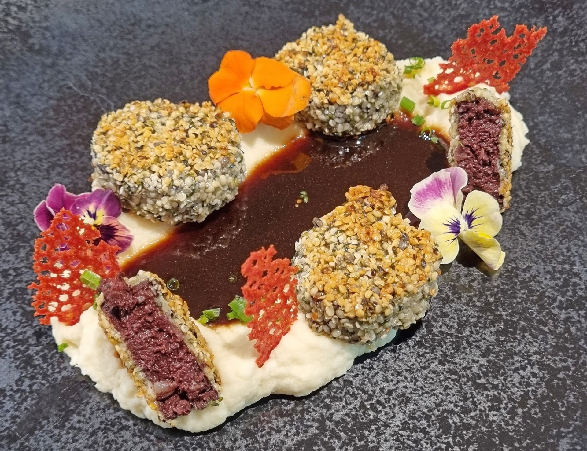Das Charolaisfilet unter der Hanfkruste, Sellerie, Rotwein, Romanesco stammt von artgerecht gehaltenen und zumeist auf der Weide geschossenen Tieren aus der Umgebung. Und Vegetarier kommen hier ebenfalls auf ihre Kosten, die sich ein Gourmetmenü mit Demeter-Tomaten, Basilikumöl, gebratenem Ziegenkäse, dann geeister Radieserl-Joghurtschaum, gefolgt von Blaumohn-Gnocchi mit Birnbaum-Saibling und Rote-Bete-Schaum bis zu Rhabarber mit Prosecco und Vanille schmecken lassen können.