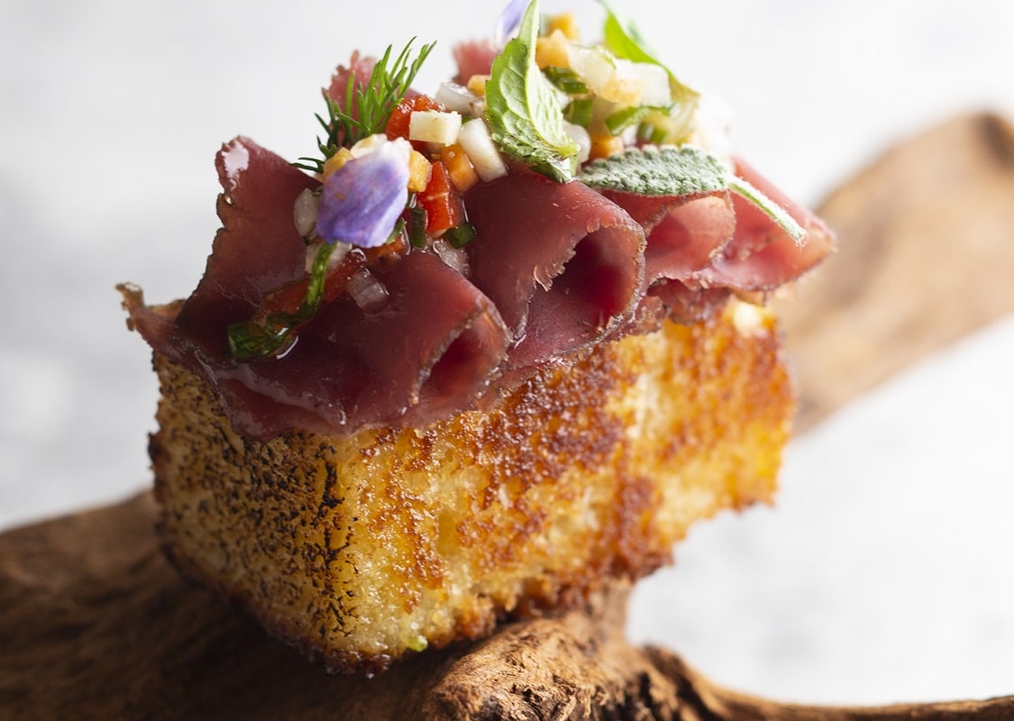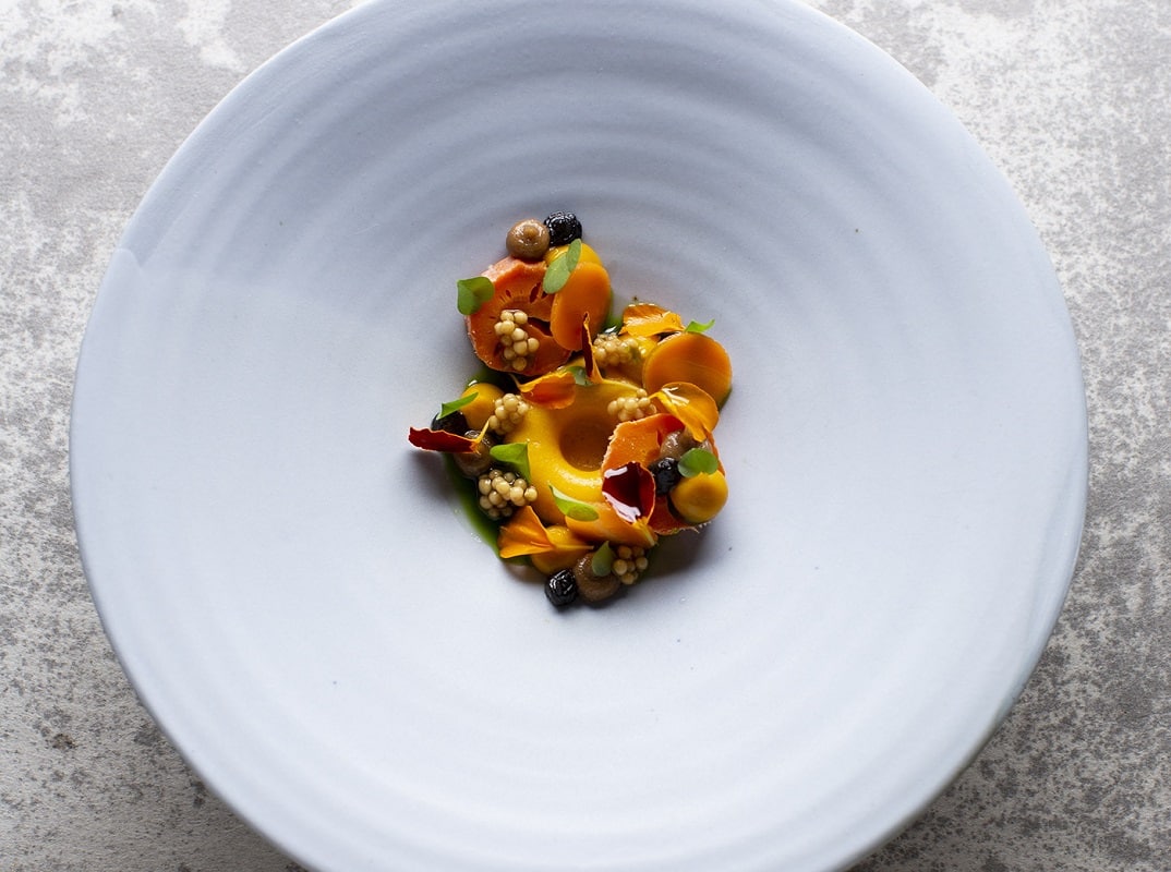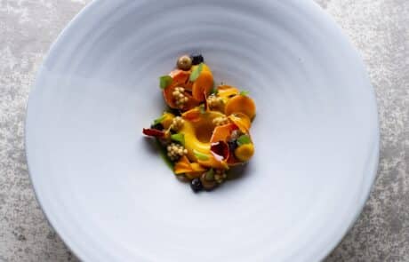Eine von Udos Lieblingszutaten ist der japanische Superpilz Koji. Er spielt die tragende Rolle im Auftakt des aktuellen Menüs, seiner Signature: Koji-Karotte mit Melonenschale, Amazake und Tagetes. Ebenso wie bei der Tomate mit Büffelmozzarella und Fichtensprossen sorgen ungewöhnliche Kombinationen und unkonventionelle Zubereitungsmethoden für kulinarische Aha-Erlebnisse. Zwischen Chimichurri-Pulpo, Hirschrücken mit Brioche und Shortribs aus fränkischem Wagyu überraschen eine köstliche selbstgemachte Brotzeit und eine Salty Tea Time, bevor ein leidenschaftlicher Käsegang und ein Dessert aus Himbeeren, weißer Schokolade und Knäckebrot das Menü zum intensiven Abschluss bringen.
