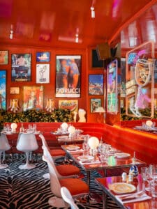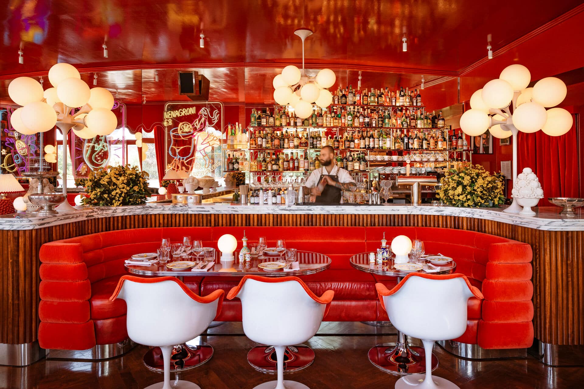 Eine Mischung aus Space Age und einem Hauch Norditalien in den 1960er – Jahren so wild präsentiert sich das Innendesign im Coccodrillo, entworfen vom hauseigenen Team kreativer Designer mit Sitz in London. Rot gestrichene Wände, die mit frechen Vintage-Fiorucci-Postern bedeckt sind, rote Holzböden, mit rotem Samt bezogene Bankette und sich drehende Stühle, rote Tische und lange, rote Vorhänge ziehen jeden Blick an. Spacig wird es durch die bunten, leuchtenden Neonsigns, die Chromaccessoires oder die 500 konvexen Spiegel, die man entdeckt, wenn man die Treppe zum Badezimmer hinuntergeht. Der Innenraum erstreckt sich bis zur runden Terrasse. Hier sitzt man in der ersten Reihe mit Blick auf den Park. Die maßgefertigten Terrassenmöbel wurden von klassischen italienischen Gartenstühlen aus den 1950er Jahren inspiriert, die Blumentöpfe von der italienischen Riviera.