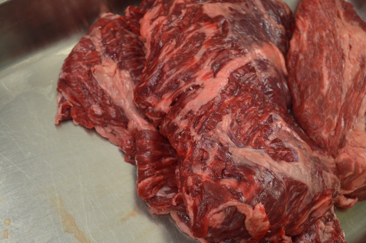 Es gibt zwei Arten von Skirt Steaks, nämlich das Inside und das Outside Skirt. Die Muskeln laufen jeweils vom Oberbauch zu den Rippen hin und trennen die Brust- und Bauchhöhle voneinander. Das Inside ist dabei innenliegend mit etwas Biss und mildem Geschmack, das Outside Skirt läuft sichtbar über den Körper und hat einen intensiveren Geschmack. Beide Stücke sind sehr lang und schmal, haben eine feine Marmorierung und sind Muskeln, die sich nicht aktiv bewegen. Dadurch zählen die Skirt Steaks mit zu den zartesten Stücken vom Rind – Medium-rare ist daher die maximale Belastungsgrenze, die man diesem feinen Stück Fleisch zumuten sollte.