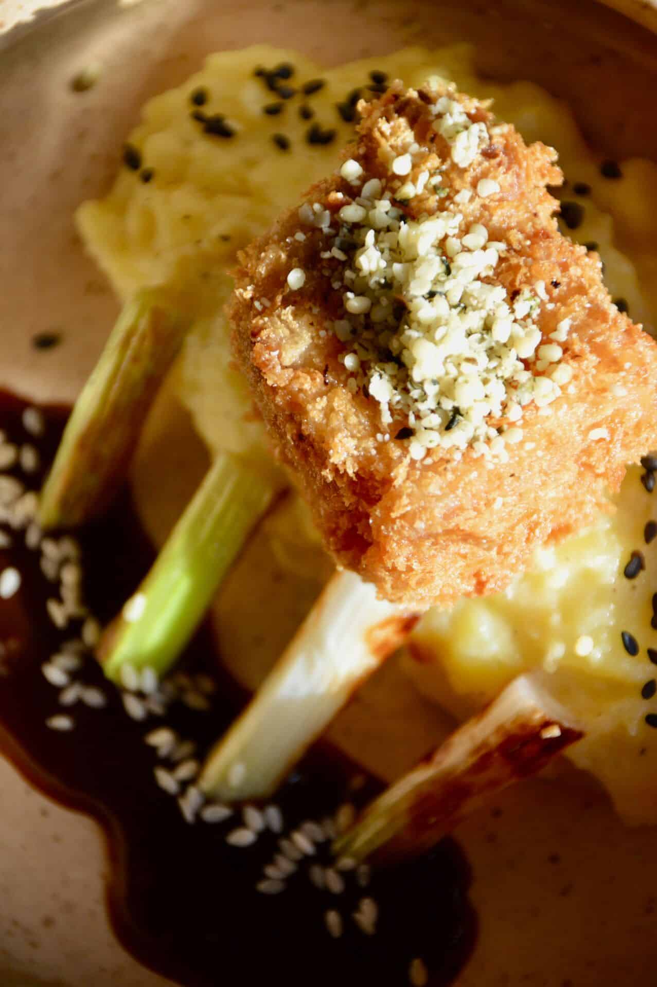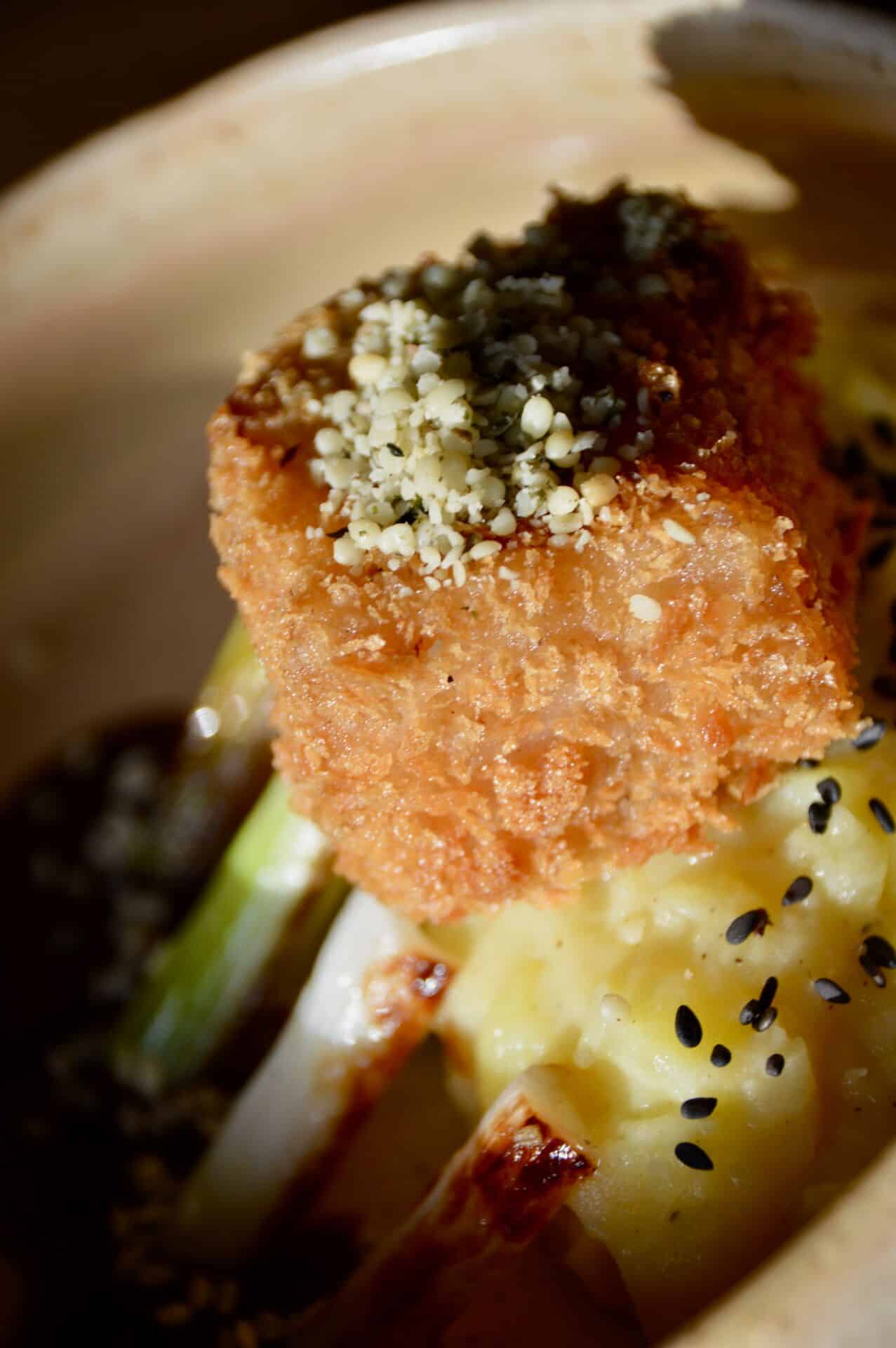 9. Dann kann angerichtet und serviert werden! Ein guter Klecks vom Kartoffelpüree bildet das Bett, darauf kommt der knusprige Schweinebauch. Die gebratenen Lauchzwiebeln kommen als Begleitung an den Rand, on top kann noch etwas gerösteter Sesam. Ich habe für ein bisschen Spielerei noch geröstete Hanfsamen on top gelegt, das nussige Aroma hat ziemlich gut gepasst.