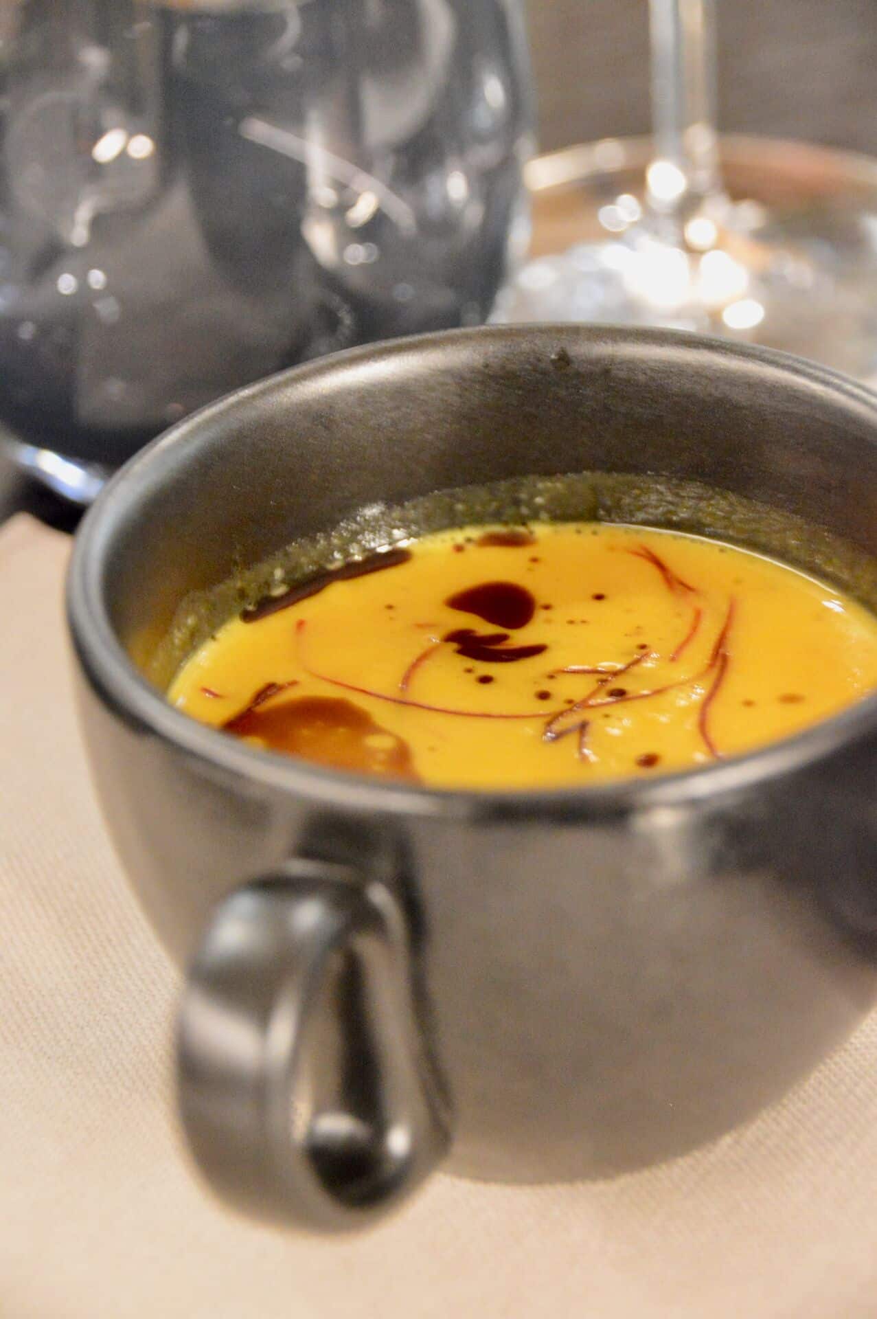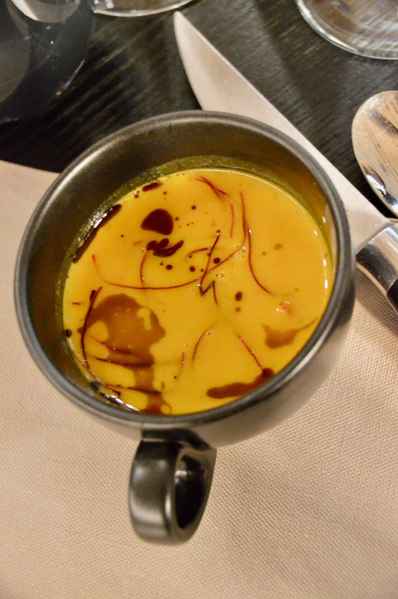 Zuerst gab es eine Kürbis-Kokos-Suppe mit Garnelen, Chili und Koriander;