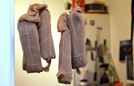 Das Filet wird mitsamt dem Filetkopf sauber pariert, Silberhäute und kleine Fettanhaftungen werden sorgfältig entfernt, damit das Fleisch überall sein Pökelsalz abbekommt und anschließend bis Weihnachten noch möglichst gleichmäßig abtrocknen kann. Das verbleibende Fleisch wird abgewogen und die passende Menge Salz ausgerechnet (Bsp.: 0,7 Kg x 35 g = 24,5 g Pökelsalz).