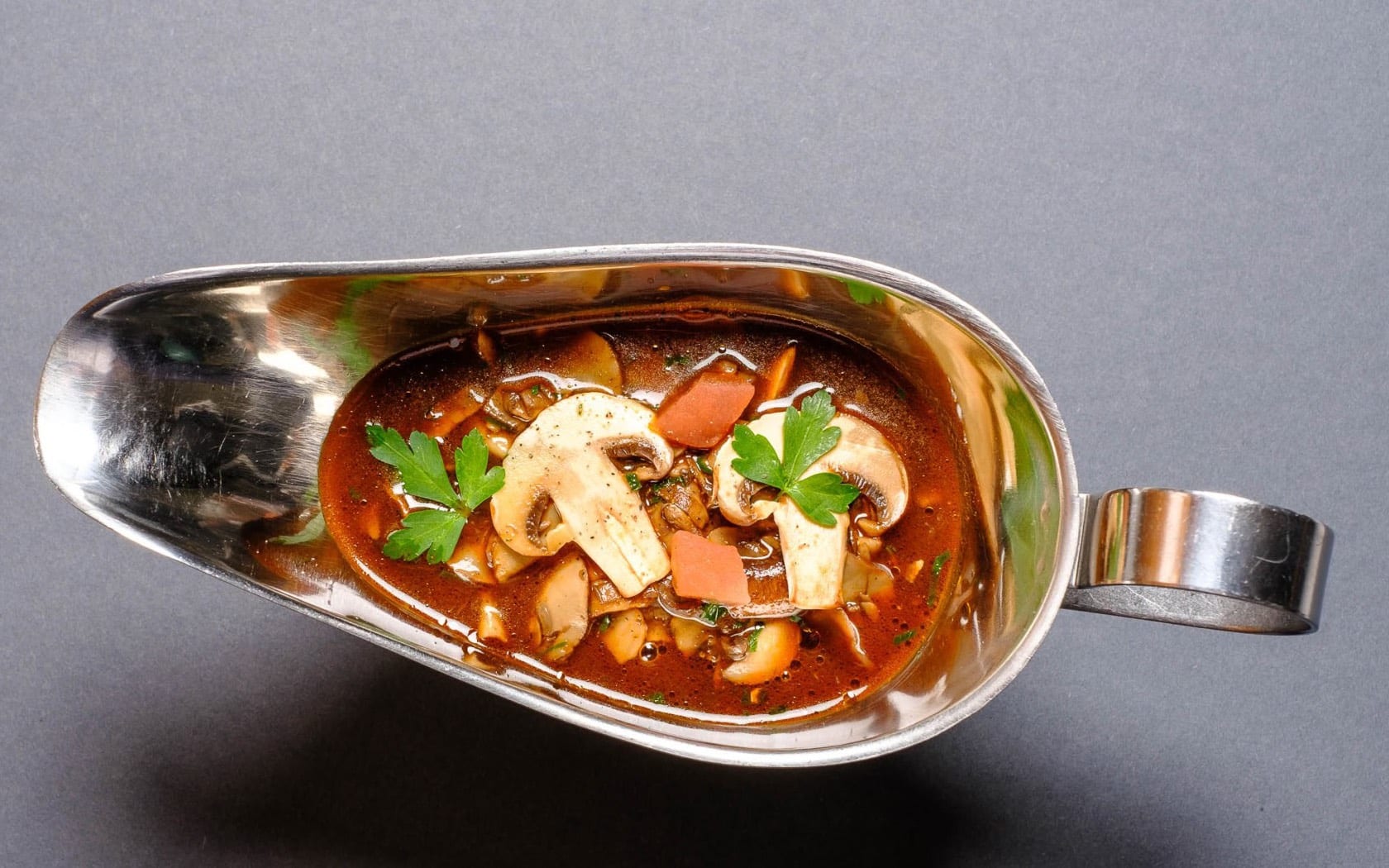 Wer eine traditionelle dunkle Jägersauce probieren möchte, kann sie einfach mit der Bratensauce selbst zubereiten und zu einem Schnitzel servieren.