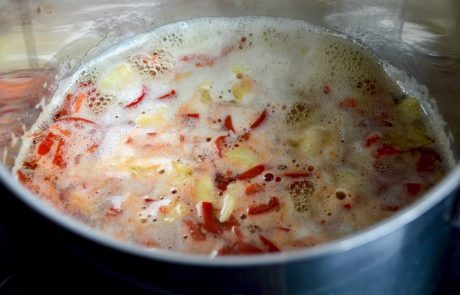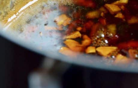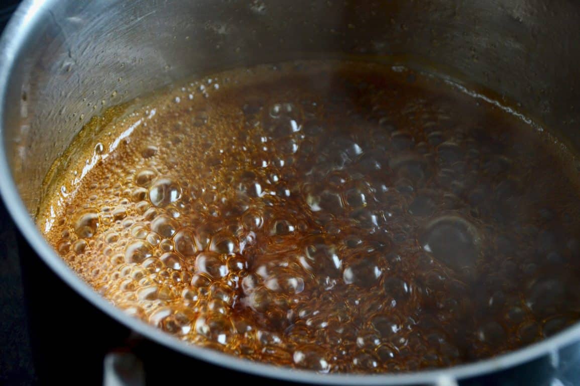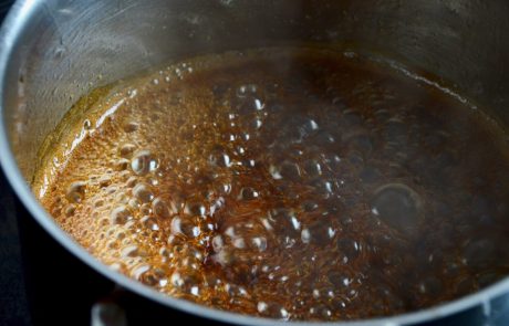 Die Sauce ist noch relativ flüssig und sollte daher einreduziert werden. Durch den hohen Zuckergehalt funktioniert das nur unter stetigem Rühren der Masse, gerne auch bei mittelstarker Hitze.