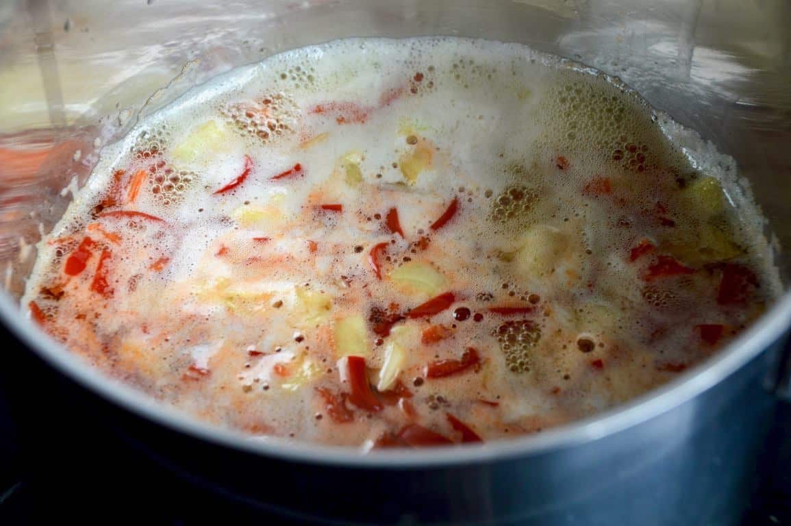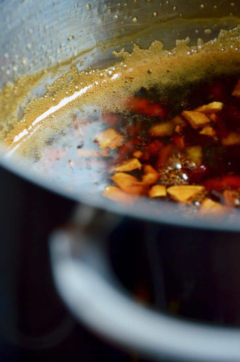Während das Öl und die Pfefferkörner erwärmen, werden 2 Knoblauchzehen, 1-2 Chilis und eine Fingerspitze Ingwer fein gehackt. Ist das erledigt, werden die Pfefferkörner aus dem Öl geholt und entsorgt. Anschließend die gehackten Gewürze ins Öl gegeben, das dann zu schäumen beginnt. Bei mittlerer Hitze werden die Gewürze dann in der schäumenden Masse für rund 5 Minuten durchgegart.