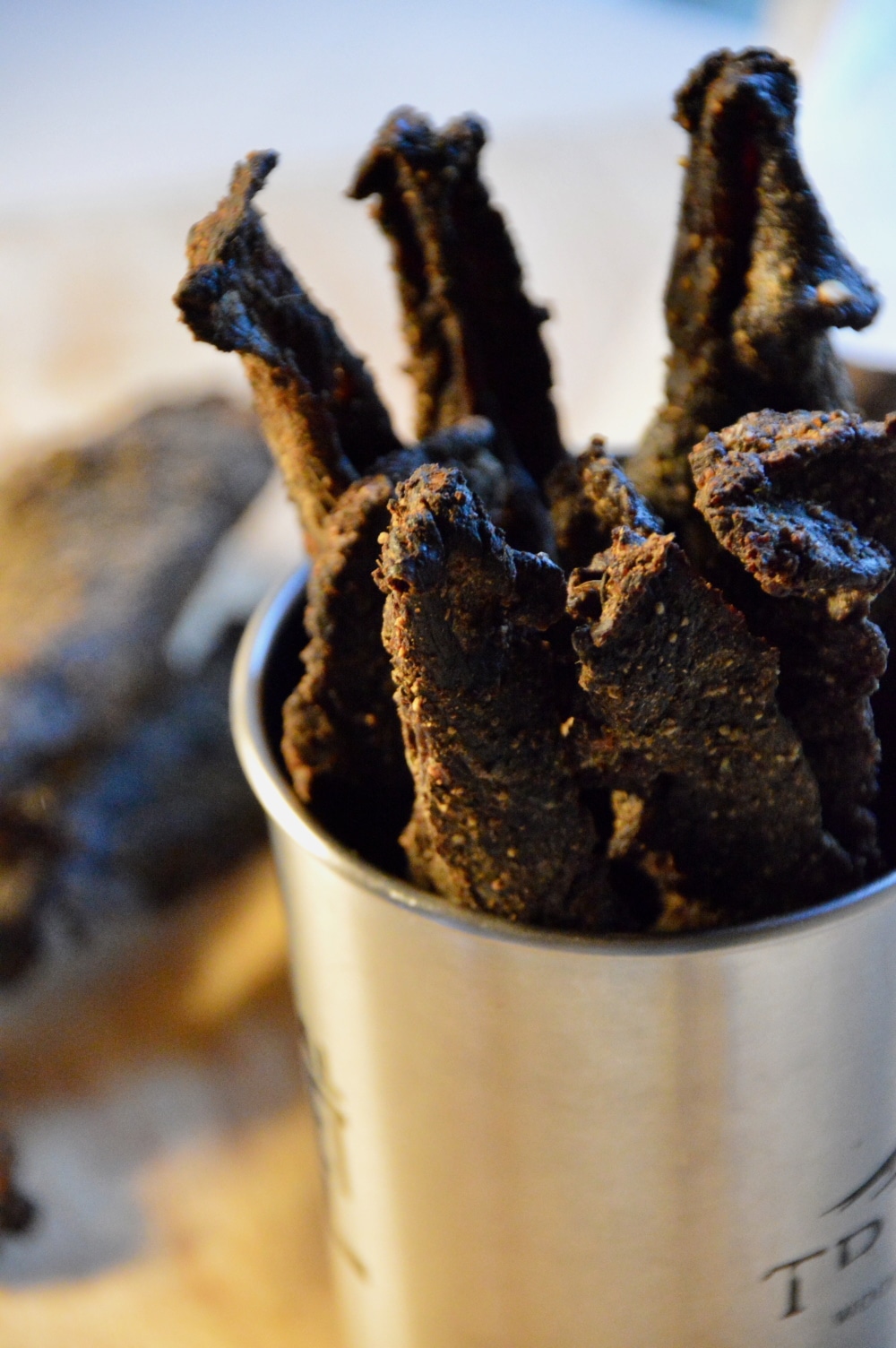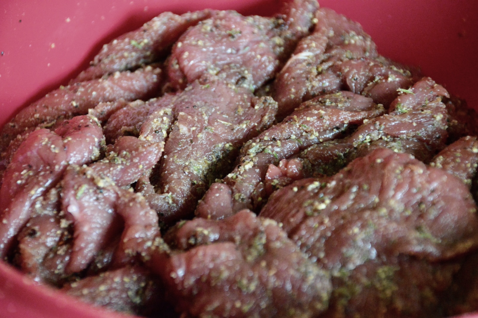 Das Trockenfleisch ist ein kleines 2-Tage-Projekt, bei dem das Fleisch aber einen Großteil der Zeit im Kühlschrank vor sich hin mariniert; den größten Aufwand hat man vermutlich mit dem Fleischeinkauf oder dem Schneiden, sofern man das selbst macht. Ich habe für dieses Rezept 1,5 Kilo Tafelspitz vom Jungbullen verwendet, das ist recht mager und die Faser ist zarter als die der Oberschale, die sonst häufig für Trockenfleisch verwendet wird.